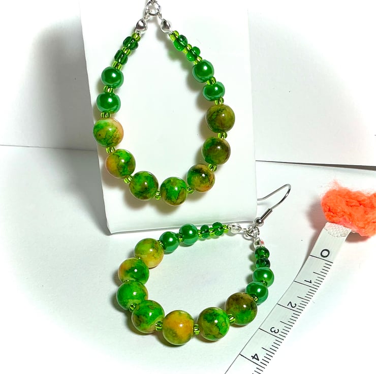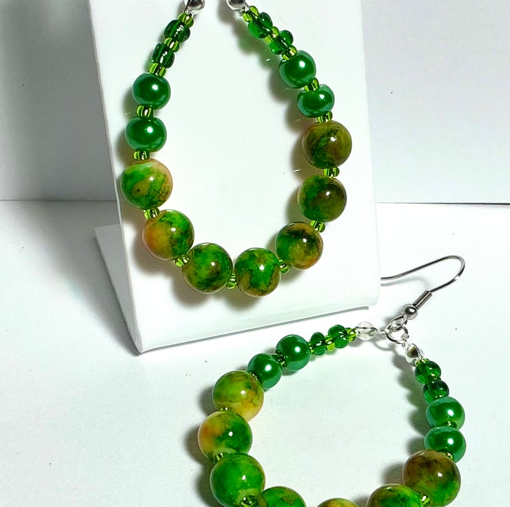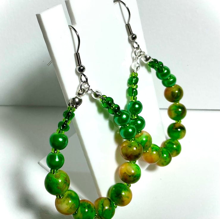 Beaded hoop earrings made using Green and Yellow mottled pattern glass beads and green faux pearls.