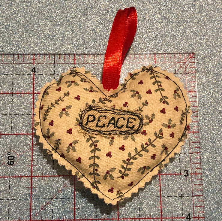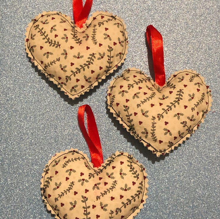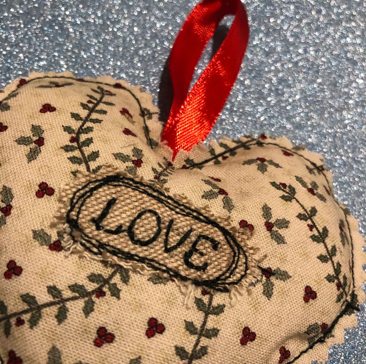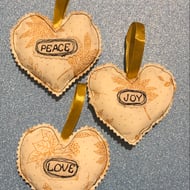 Evoke the feeling of a cosy cottage Christmas with this set of three shabby-chic style Christmas bauble hearts. Embroidered with the sentiments 'love', 'peace' and 'joy', these are perfect to hang on the tree or around the room as Christmas décor. A lovely gift to show some-one you care or treat yourself!