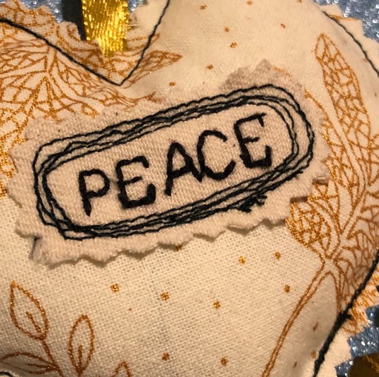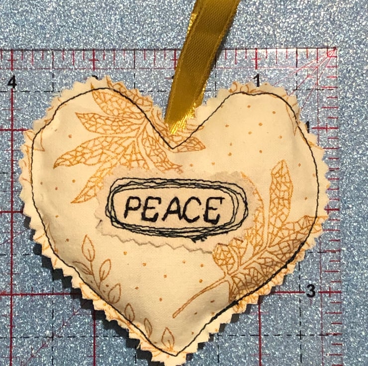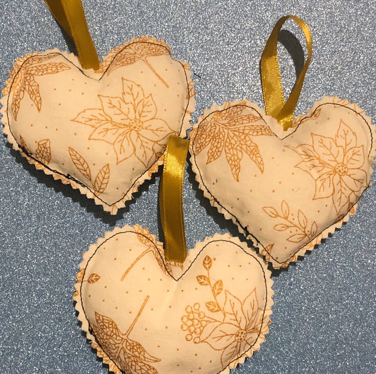 Evoke a timeless classic Christmas feeling with this set of three cream and gold, leaf and flower print fabric, Christmas bauble hearts. Embroidered with the sentiments 'love', 'peace' and 'joy' these would make the perfect gift to show someone you cared or treat yourself! Hang on the tree or around the room as Christmas décor and feel the joys of Christmas!