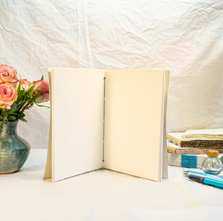 This single-section book is sewn at the spine with gorgeous Sky Blue Meisi linen thread from Pro Atelier Plus. Meisi Original Linen Thread is 100% Natural Waxed Linen. This Pro Atelier Plus thread is dyed in an environmentally friendly way, so it fits right in with the ethos of my creations, which I try to make as Earth-friendly as possible.