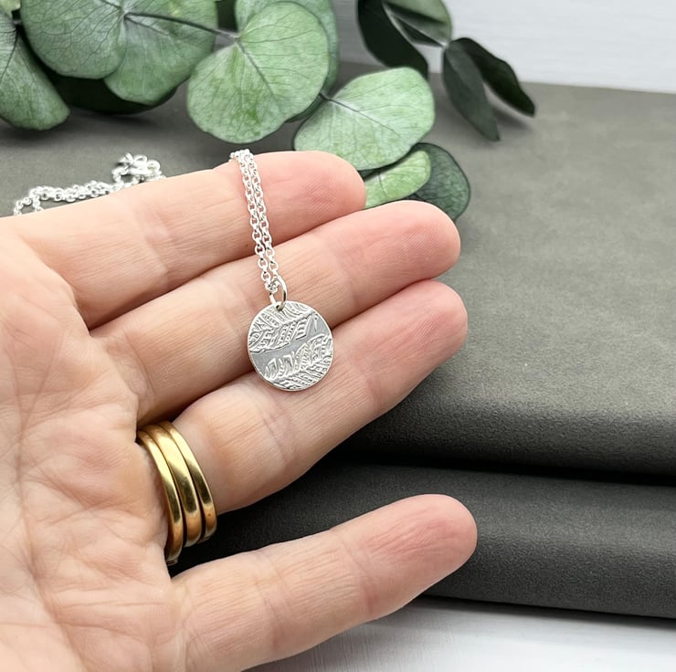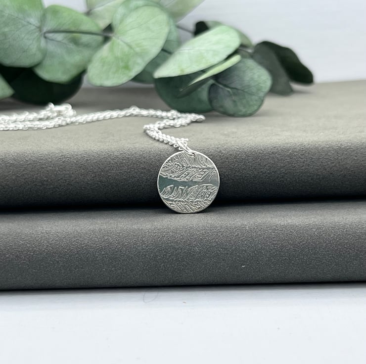 A flat disc, 1.5 cm wide with 2 feathers pressed in it. Polished to a mirror shine and suspended from an 18” (45 cm) long sterling silver chain.