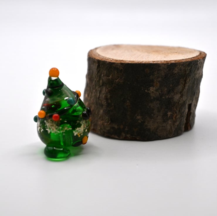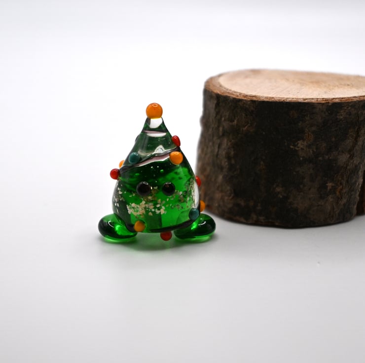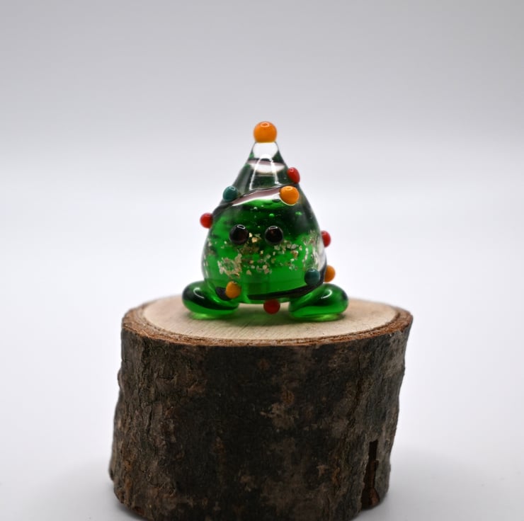 It has been made using green and clear glass and has been decorated with glass christmas lights and gold glitter.
