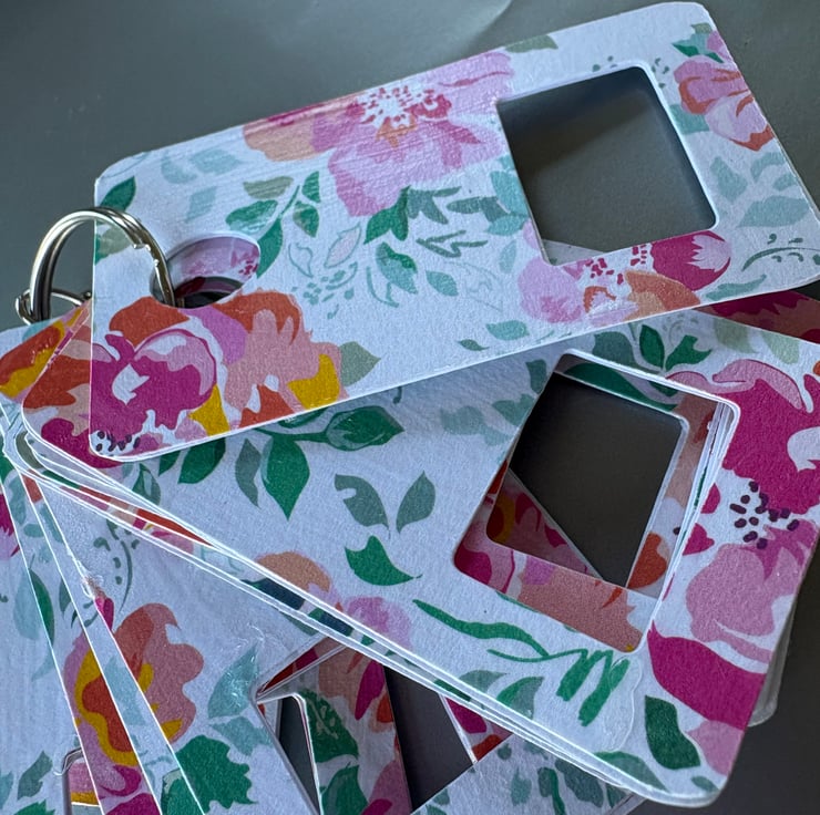 Keep your embroidery threads beautifully organised with this charming handmade pack of floss drops. Each drop is cut from sturdy card with a soft gloss finish and decorated with pretty patterns.