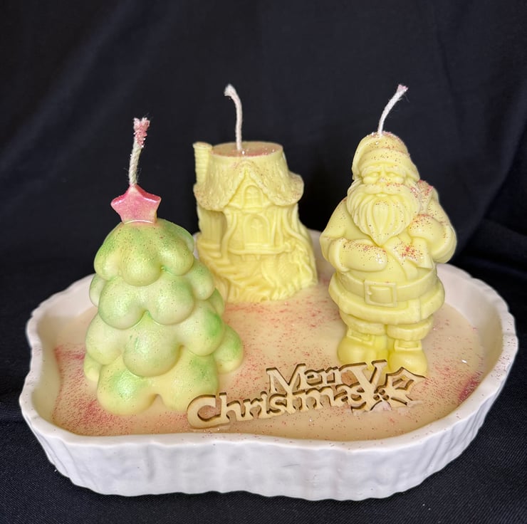 A cute holiday gnome sits beside my handcrafted soy wax figures — a pastel Christmas tree, Santa Claus, and a festive gift box. All arranged on a snowy tray with a tiny “Merry Christmas” sign.