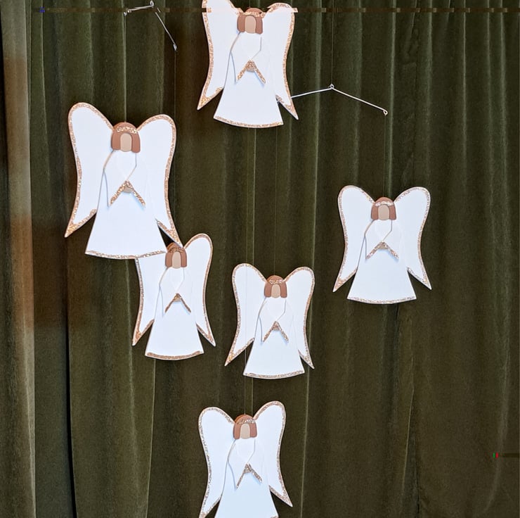 Angels are an important part of the Christmas Story. There is wonder and beauty in the story of God who 'so loved the world that He gave His only Son...' (You'll find more in the Gospel of John, chapter 3, verse 16). I hope that in this mobile some of that wonder and beauty is hinted at, and that it gives pleasure as the angels move around and sparkle in the light.