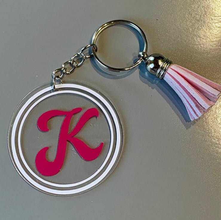A stylish personalised keyring featuring a clear acrylic circle with a bold vinyl initial in a vibrant turquoise shade. Finished with a matching faux-suede tassel and a silver-tone keychain, this lightweight accessory makes a perfect gift for birthdays, teachers, stocking fillers or treat-yourself moments.