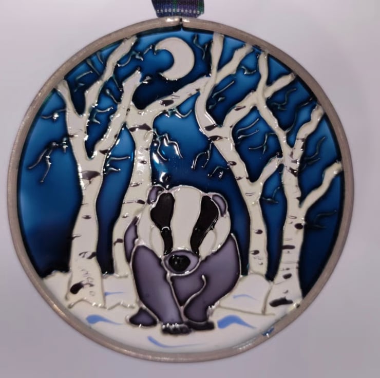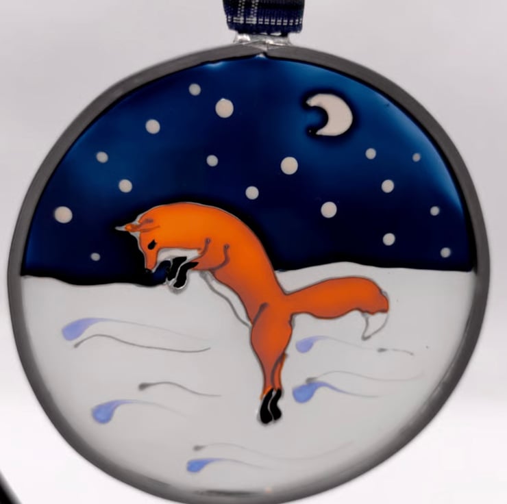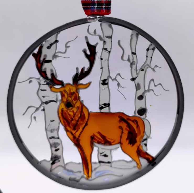 Hand painted using specialised glass paints, this roundel can be hung on a Christmas tree or in a window all year round. It is made from glass sheet, cut into a circle with a lead edging soldered on and hangs from a tartan ribbon. It's approximately 7cm diameter.