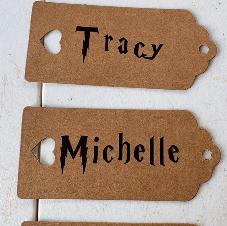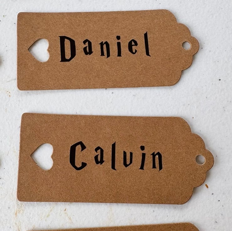 These personalised craft place-name tags are perfect for weddings, parties, gifts and special events. Each tag is cut from thick kraft card and finished with crisp black vinyl lettering in a bold, magical-style font that gives every name a striking, unique look.