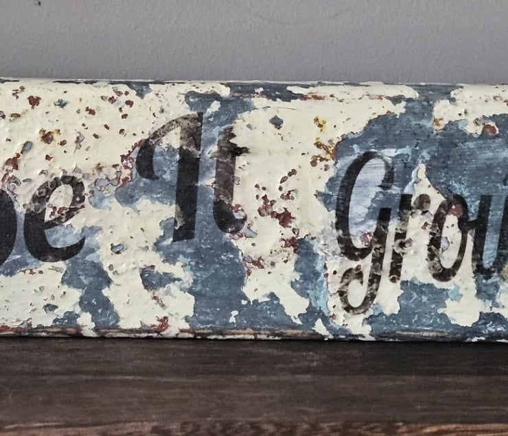 Finished with a salt-paint distress technique to create a weathered, flaked-paint look — perfect for a cottage-garden or farmhouse aesthetic.