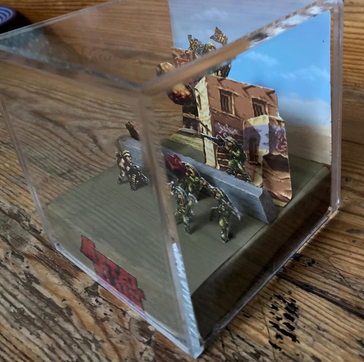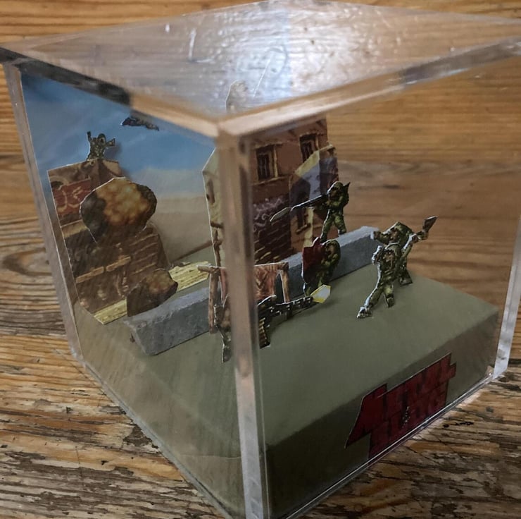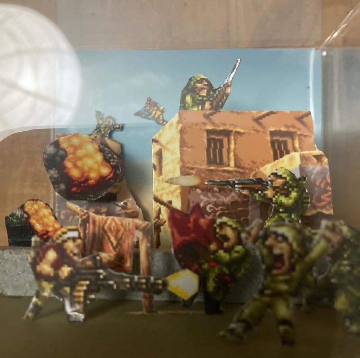 Square Diorama and tribute to the Metal Slug series, depicts characters and enemy ai in an explosive action scene! Dimensions are: 10x10x10cm cube! Made with premium quality glossy card printed and high quality print.