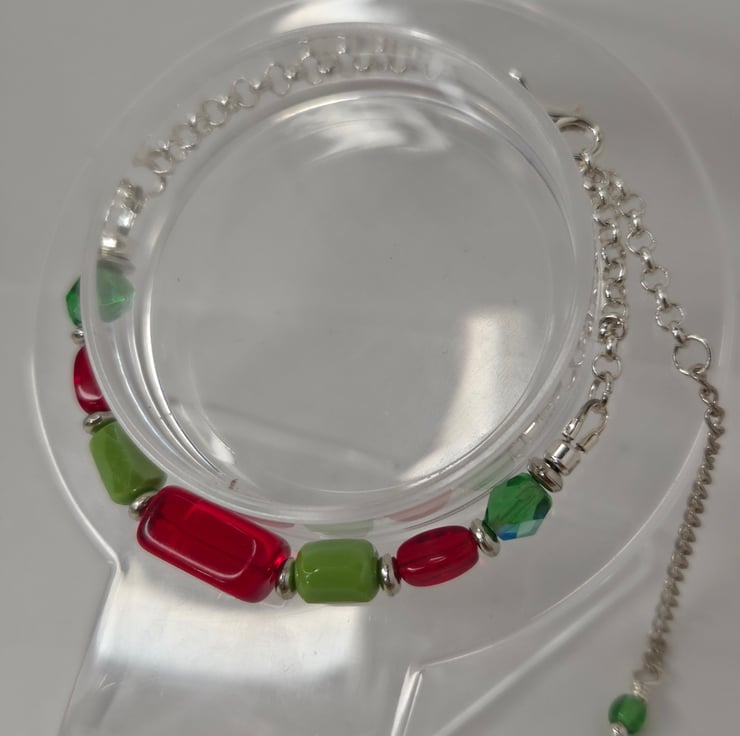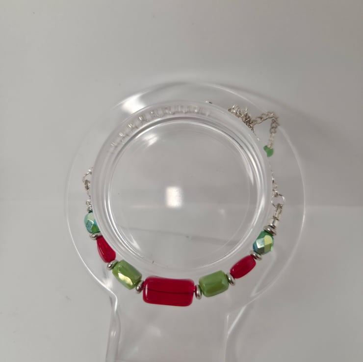 This elegant handcrafted bracelet features a striking combination of rich ruby-red and fresh leafy-green glass beads, beautifully balanced with silver-tone spacers and a fine adjustable chain. The smooth, glossy beads catch the light effortlessly, creating a vibrant yet refined look that suits both everyday wear and special occasions.