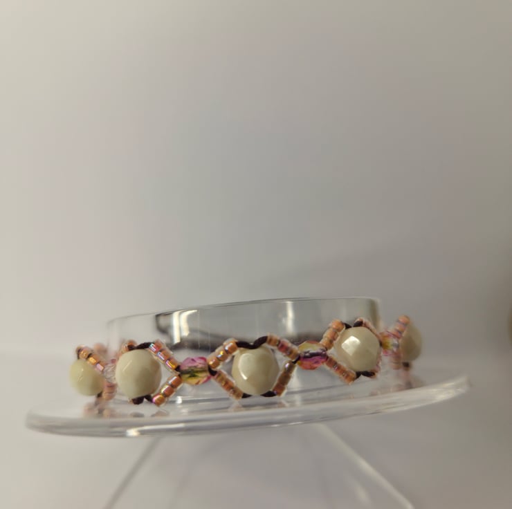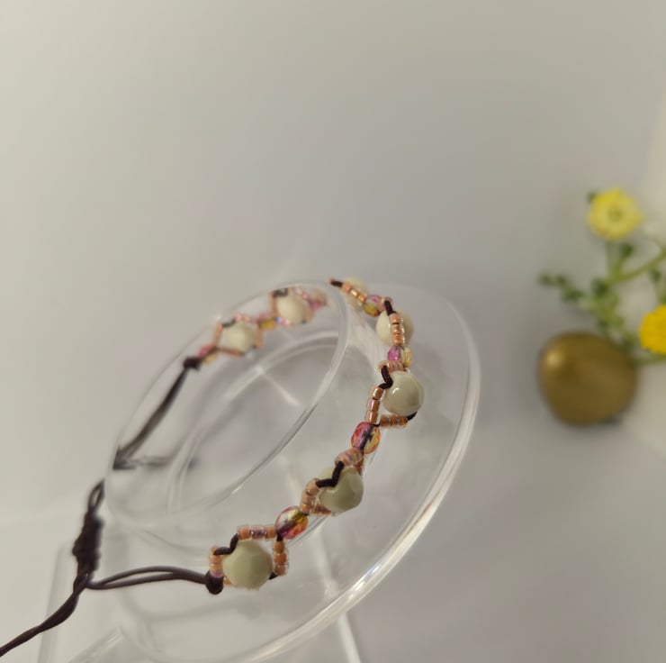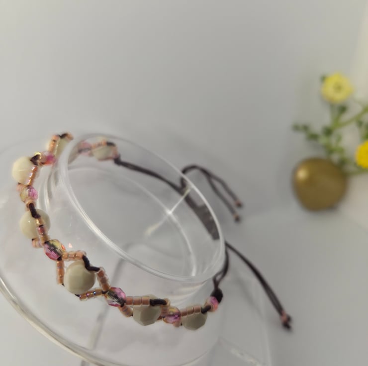 This beautifully handcrafted bracelet features soft cream-toned statement beads intertwined with shimmering iridescent seed beads, all delicately woven onto rich dark cord. The subtle glow of the pastel glass catches the light with every movement, creating an elegant yet relaxed boho aesthetic.