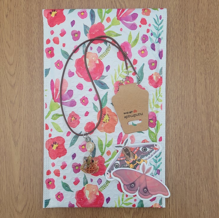 Royal Mail 2nd Class. Packaging may slightly change depending on how much I have sold (Tissue paper or stickers) The stickers are not my design.