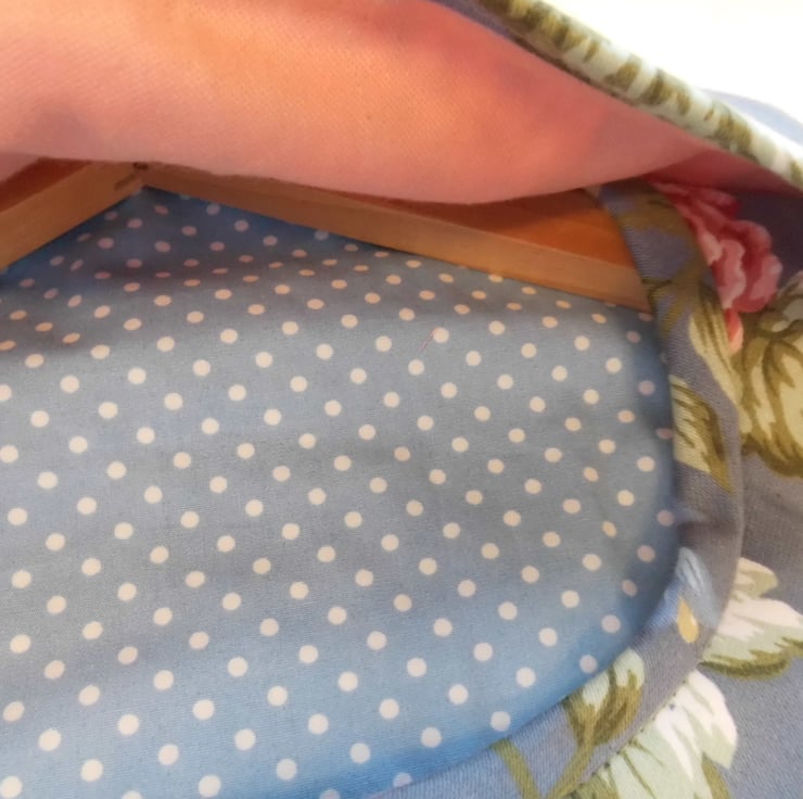 I made my own bias binding from the fabric to bind the opening. On a wooden coat hanger so it can hang on your line, in your kitchen or laundry room. I have used an overlocking stitch all around inside for strength and neatness. The design of my peg bags means that the upper and lower fronts are both supported by the hanger, which gives them added strength.