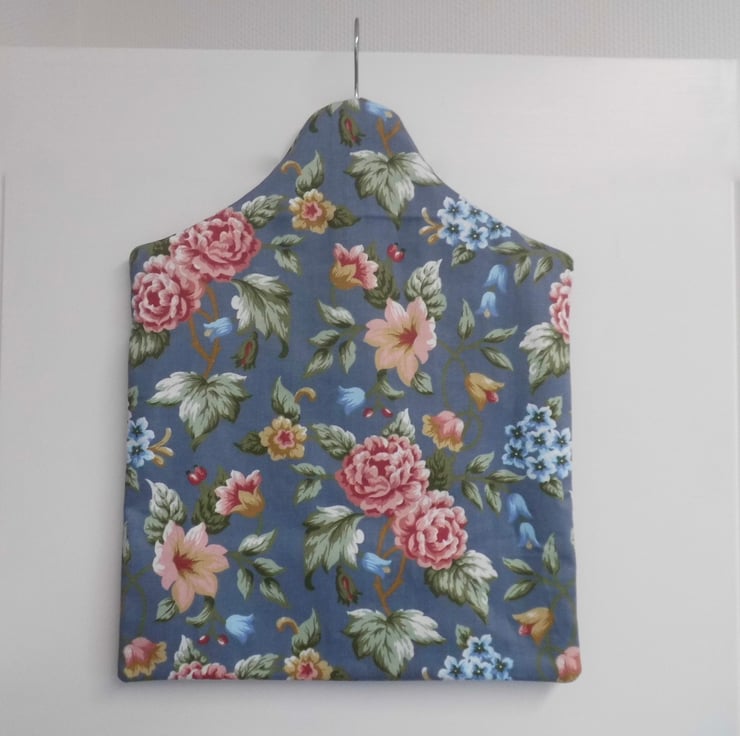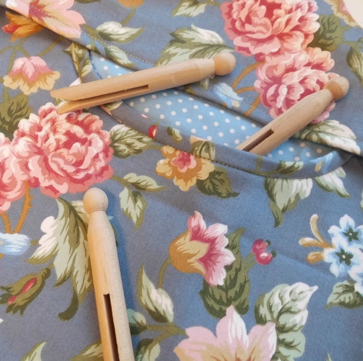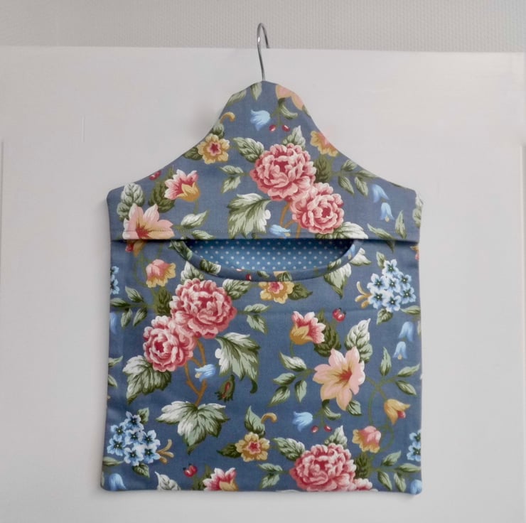 A fully lined peg bag made with a sturdy, mid-weight furnishing fabric by Sanderson which has a blue background and floral print of blue, green and pink. The back is lined with blue and white spotted cotton fabric and you can see this through the opening. The front is lined with peach colour cotton fabric.