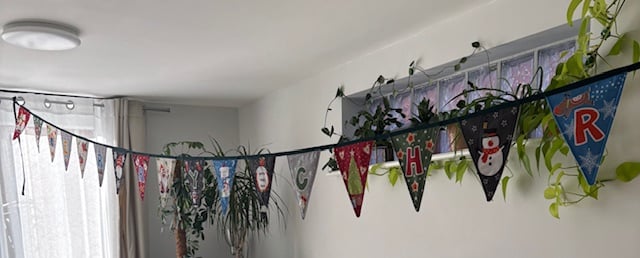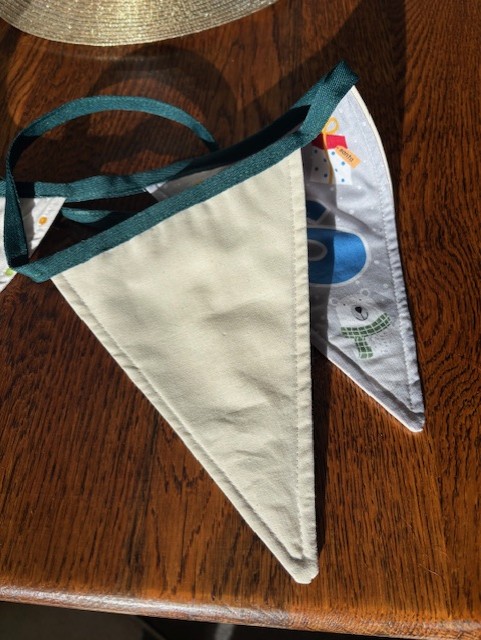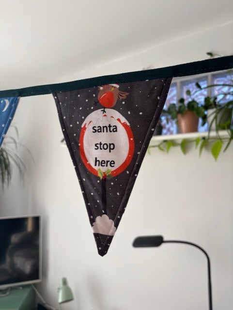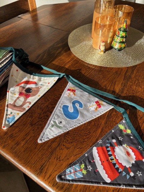 Each pennant is individually cut, sewn, lightly padded & pressed using a mix of colourful Christmas fabrics. The letters are bold and easy to read, and the alternating flags feature robins, Santa, snowmen, puddings, candy canes and other seasonal favourites. Each one is sewn individually, so every strand has its own little quirks and personality, giving you a decoration that feels truly made for your home.
