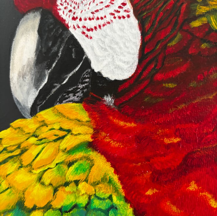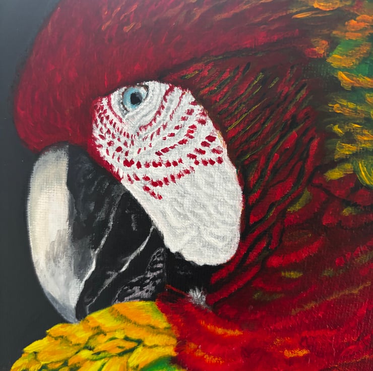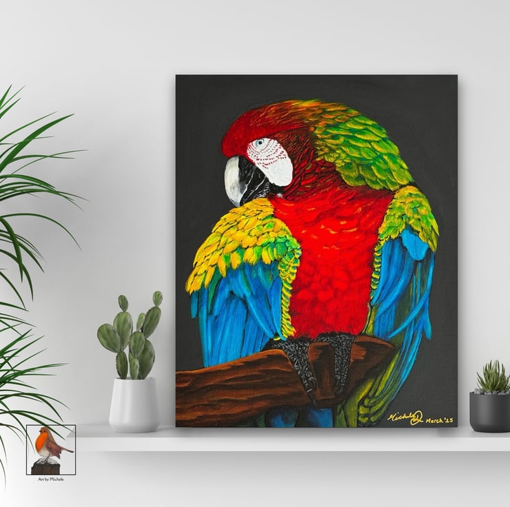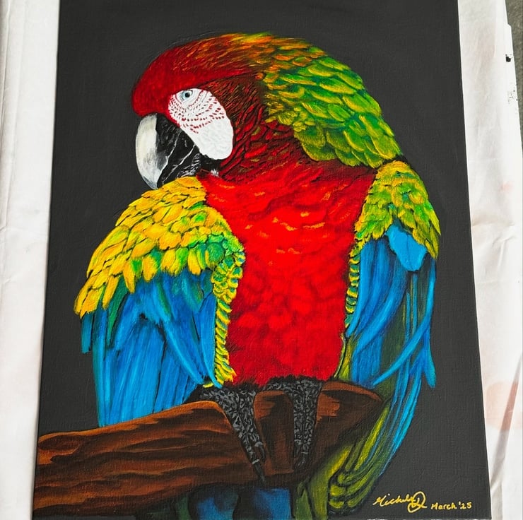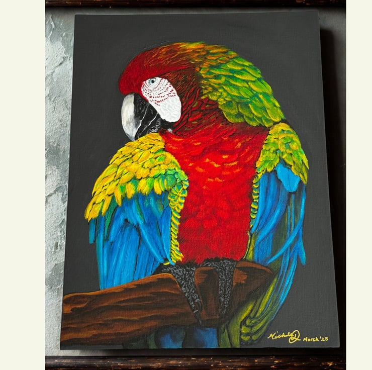 Original acrylic painting of a Red Macaw, created by me. This one-of-a-kind piece celebrates the macaw’s striking feathers, expressive face and vibrant personality — perfect for bird lovers, wildlife fans, or anyone who wants a statement artwork full of energy and warmth.