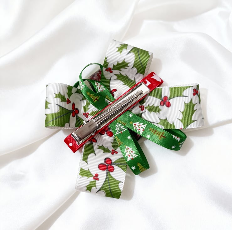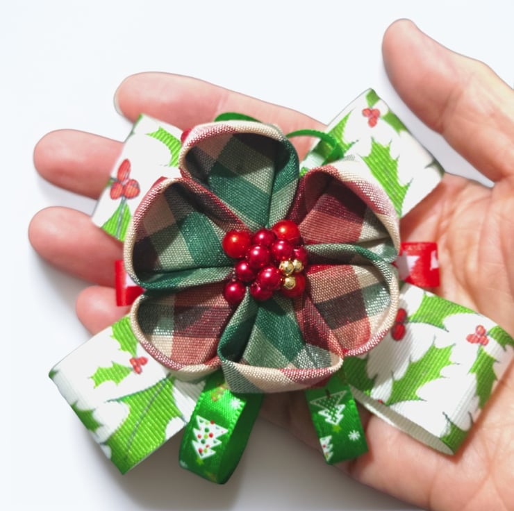 This festive handmade hair clip adds a cheerful touch to any Christmas outfit. It features a beautifully crafted layered flower made with a mix of Christmas-themed ribbons in holly, tree, and plaid patterns. At the centre sits a cluster of red and golden beads, adding a warm, seasonal sparkle.