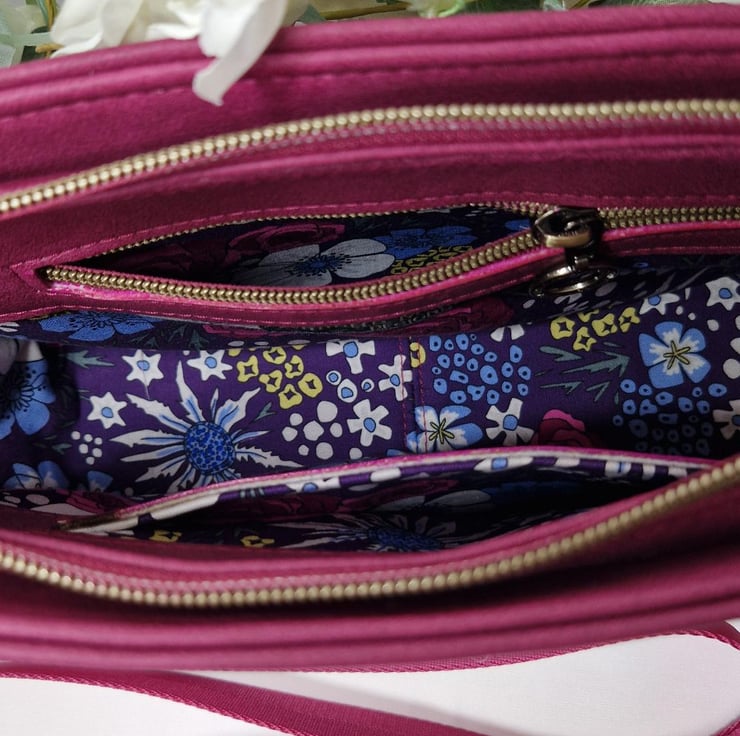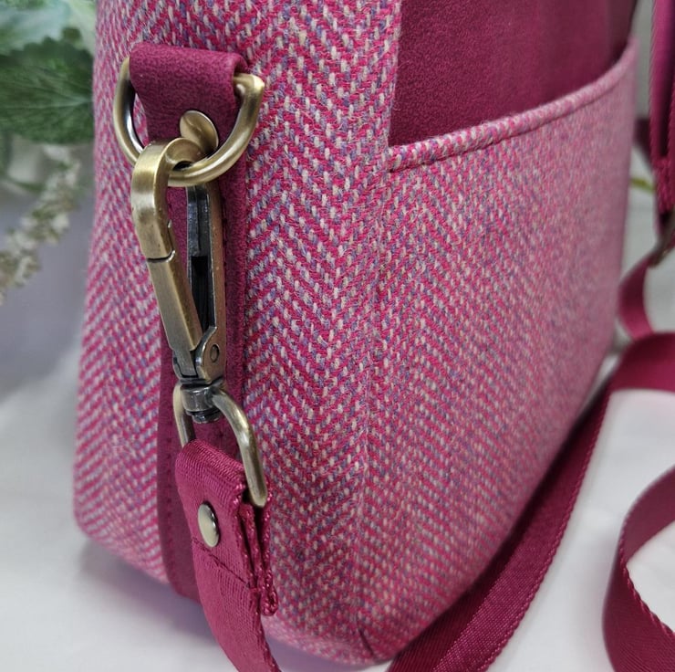 The Eden Crossbody Bag is made from beautiful Campion Crush herringbone Yorkshire tweed and soft Mora luxury faux leather in gorgeous Amarynth. Practical yet stylish, the front slip pocket has a hidden zipped pocket. It also has a rear slip pocket which fastens with a magnetic clasp. Inside, the coordinated cotton lining has another zipped pocket plus a slip pocket. The bag closes with a recessed zip and is worn across the body with a detachable webbing strap.