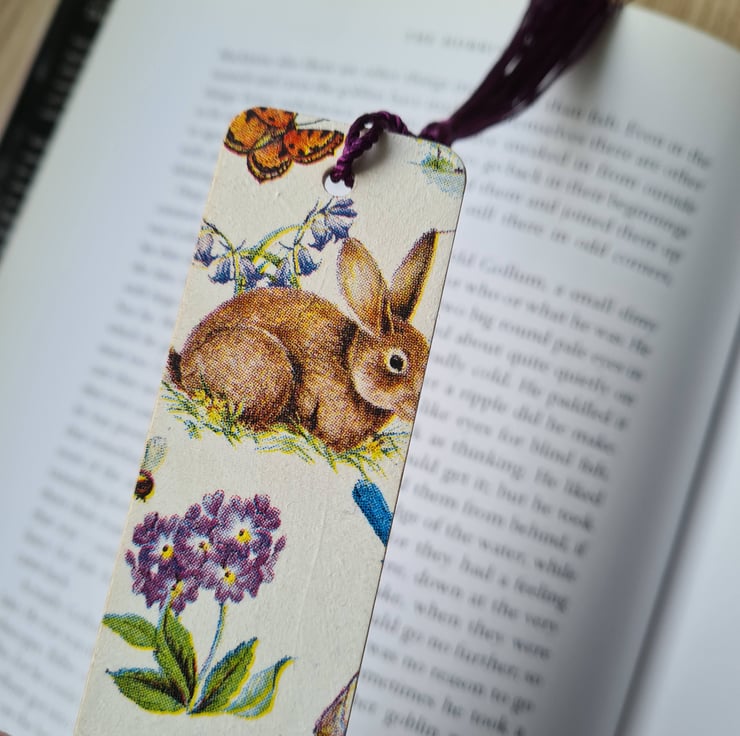 This wooden bookmark has been decoupaged using a charming woodland/floral design featuring a cute rabbit. It has been varnished to protect it and finished with a tassel.