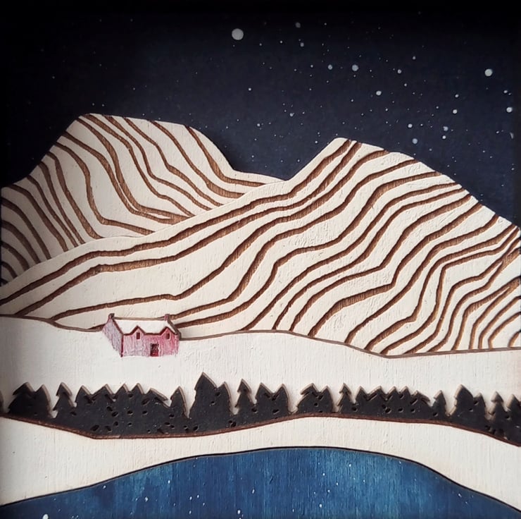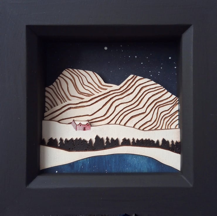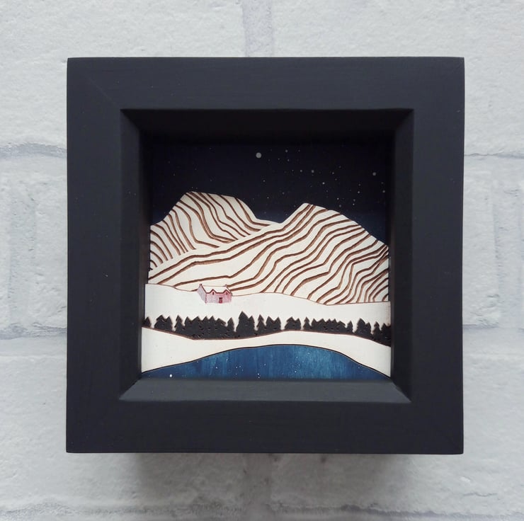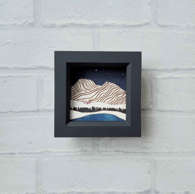 'Cold Mountain' - this one of a kind miniature diorama picture features a little house in the snowy mountains, and is inspired by my love of the Scottish wilderness and landscape.