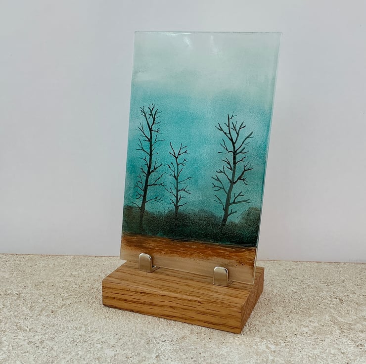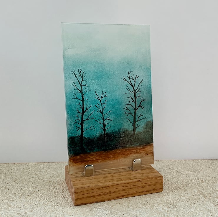 This atmospheric treescape of bare winter trees in silhouette has been hand-painted onto a clear glass panel using specialist glass enamels. The background is applied first using a wash of turquoise and light blue enamels, and the panel kiln-fired to 'set' the enamel. The trees and foreground are then painted on, and the panel fired for a second time.