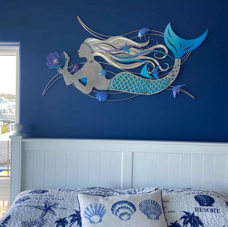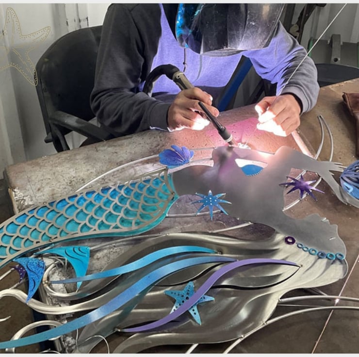 Measuring an impressive 4ft x 2ft with a depth of 8cm, each mermaid is brought to life with remarkable attention to detail. The graceful mermaid figure is depicted holding a metallic blue clam that cradles a lustrous, shiny pearl. Surrounding her, intricately welded angelfish, starfish, and a mesmerizing jellyfish with wire tentacles add layers of depth and intrigue, making this sculpture a truly unique statement piece.