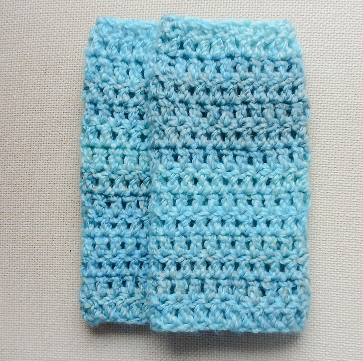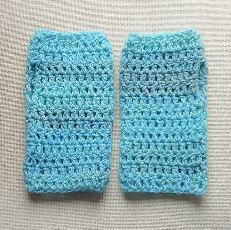 Composition: They are crochet in the round and so there is no seam. There is a hole for the thumb.