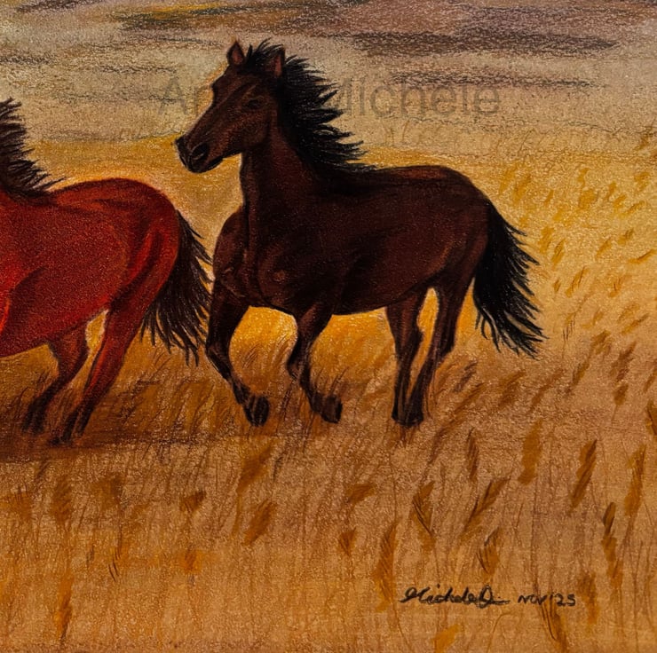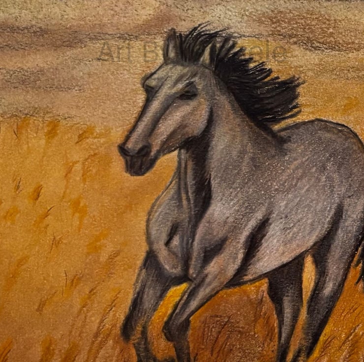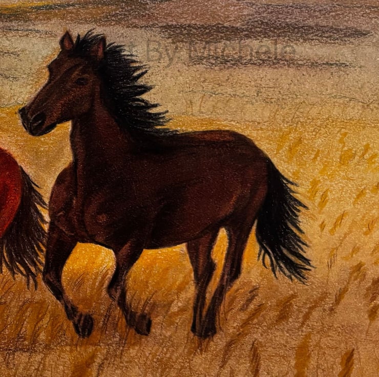 I was eager to create artwork with motion, incorporating a vast landscape with galloping wild horses was the perfect fit for this piece. I began the process with mapping out my landscape using pastels and then adding the horses with colour pencils.