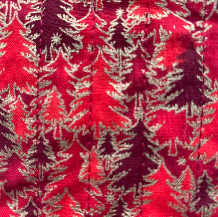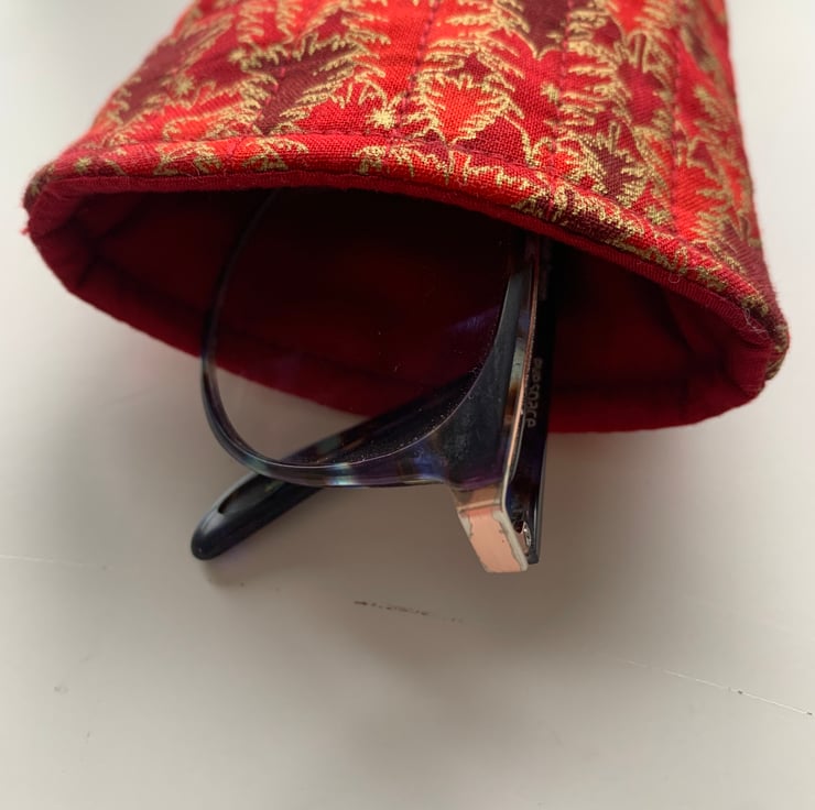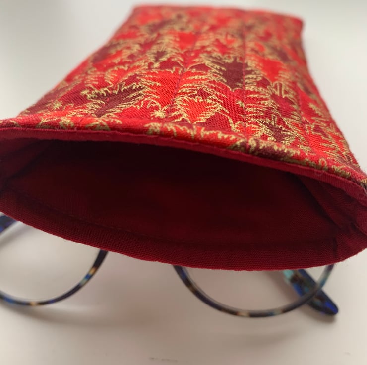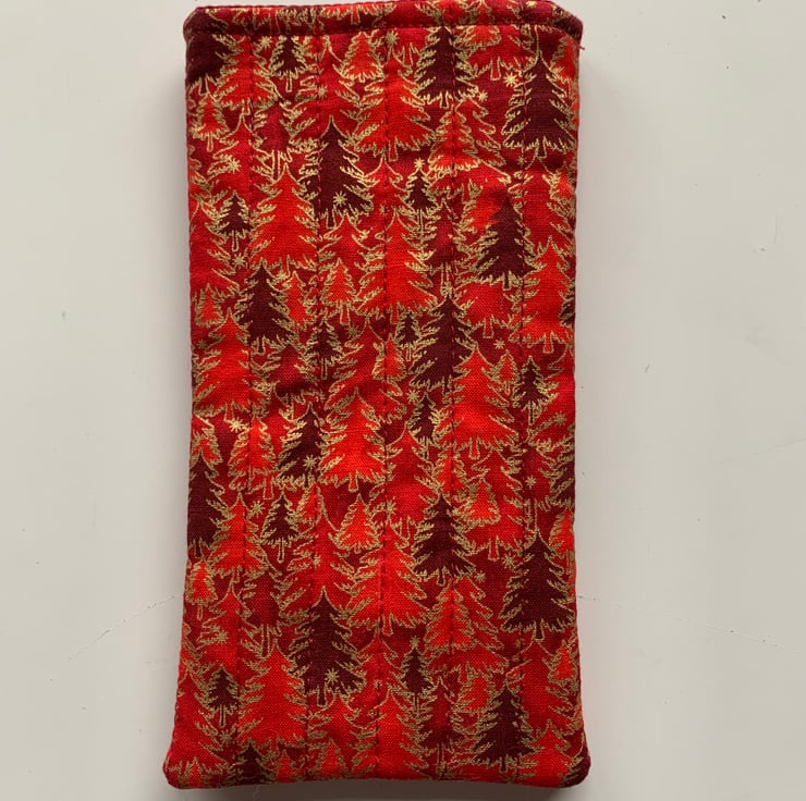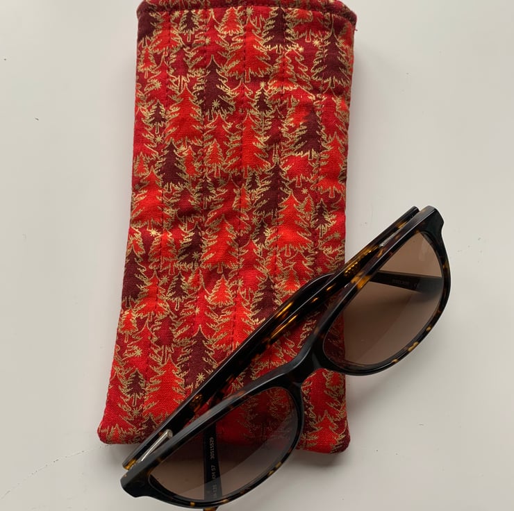 The padded slip in style glasses/sunglasses case is made in this lovely Christmas tree fabric print with gold highlights on a red background.