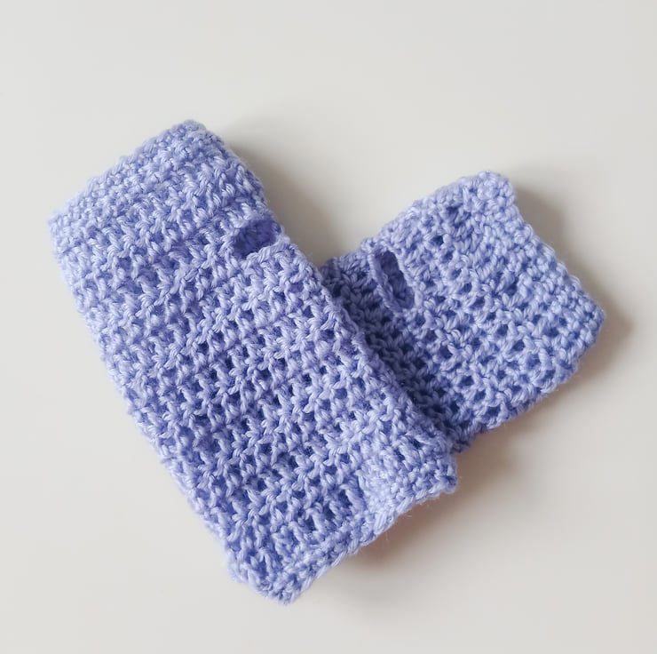 Composition: They are crochet in the round and so there is no seam. There is a hole for the thumb.