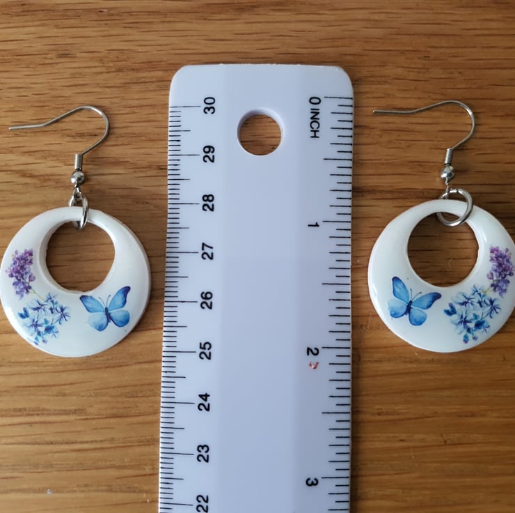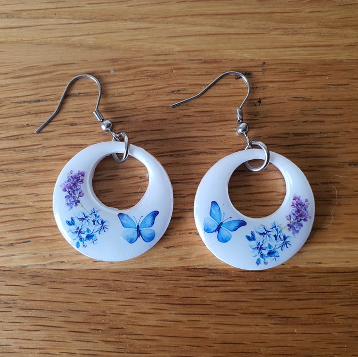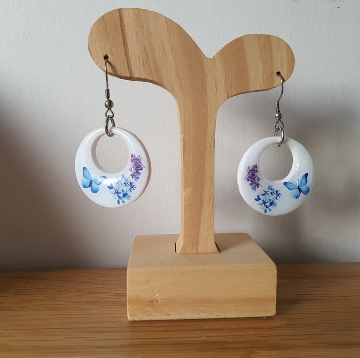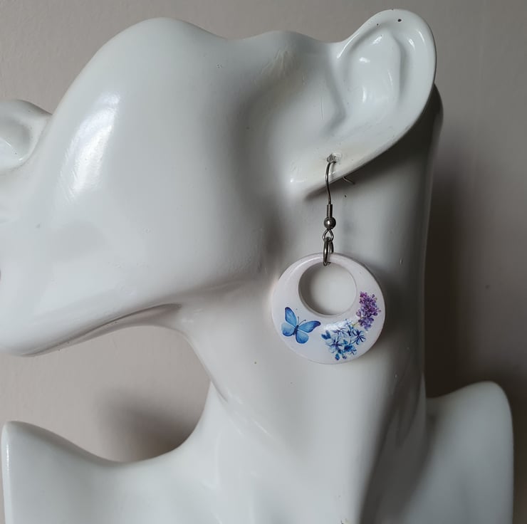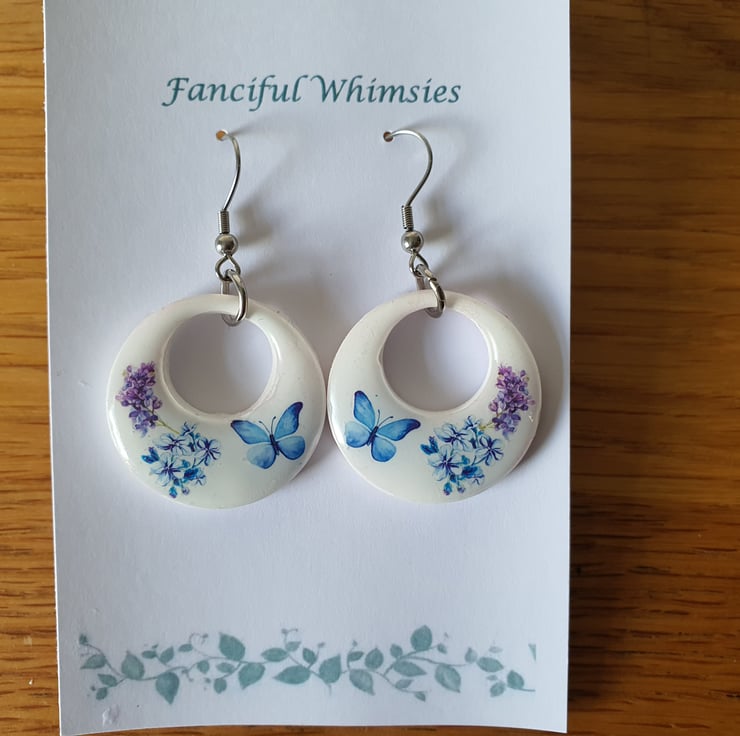 These lightweight earrings are made with eco-resin. They have a delicate design of flowers and a butterfly.