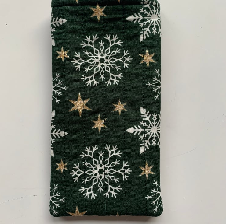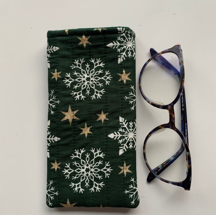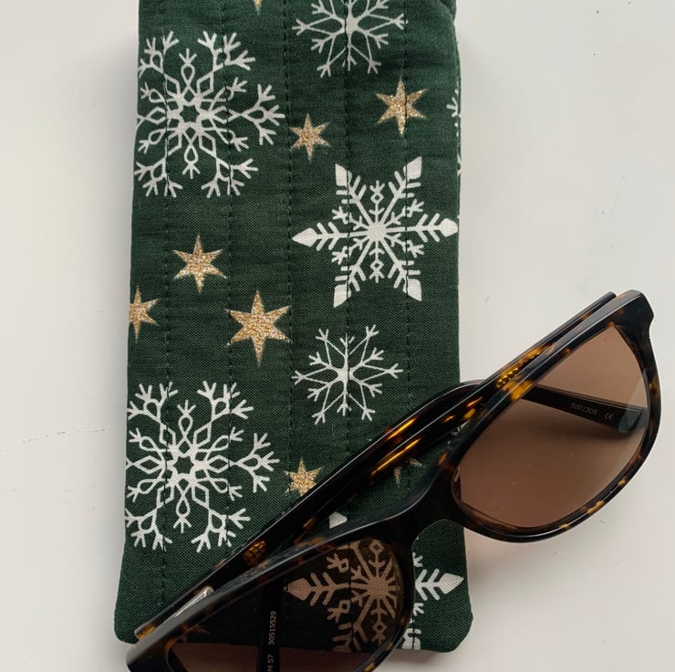 The padded slip in style glasses/sunglasses case is made in this lovely Christmas snowflake fabric print with gold stars on a dark green background.