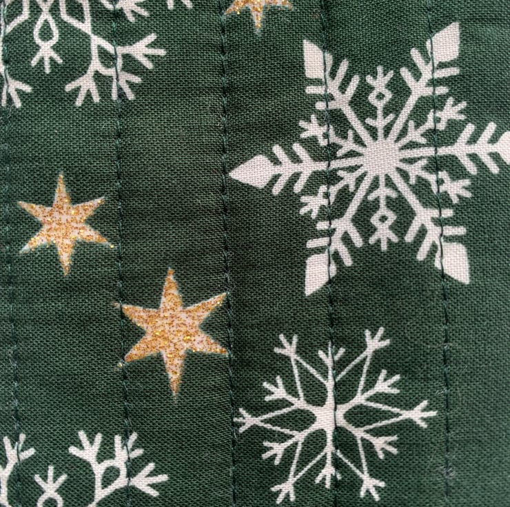 The case is quilted with dark green colour thread and is fully lined in plain dark green cotton.