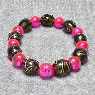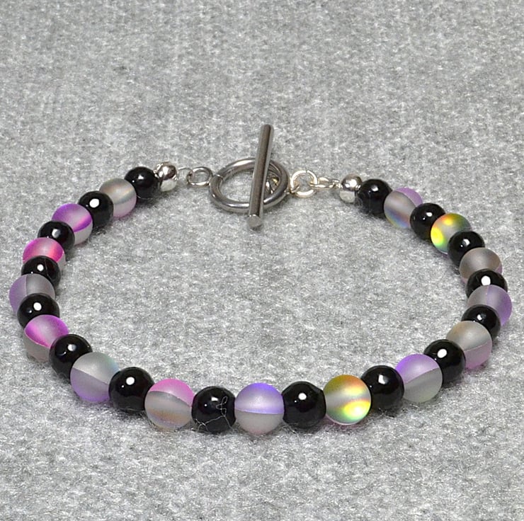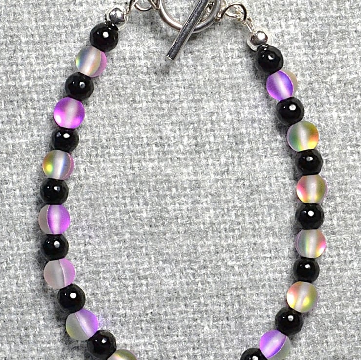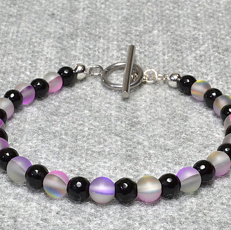 The frosted glass beads are truly beautiful, with a central layer that makes them shine bright pink on one side and gives them a yellow-toned AB shimmer on the other. In this bracelet, they are complimented by gently faceted black glass beads.