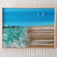 Framed picture, made with sea glass/ beach glass found at Poole Harbour. Sunset background, painted with acrylic paints.