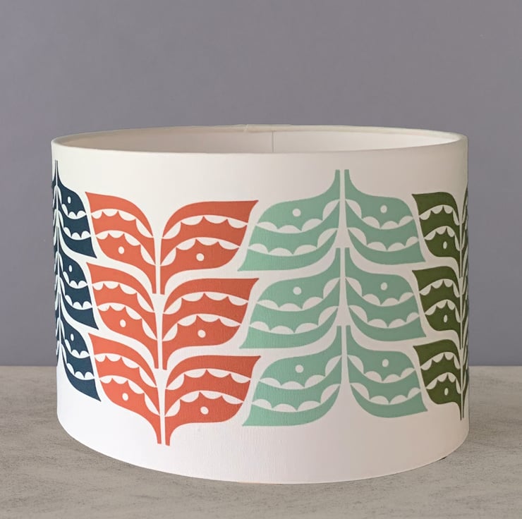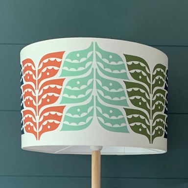 A vibrant leaf design with a layered repeat design in Cinnamon, mint, moss green & rich navy. With a layered repeat and vintage leaf shape this lampshade is a lovely vintage Scandinavian colour statement for your home.