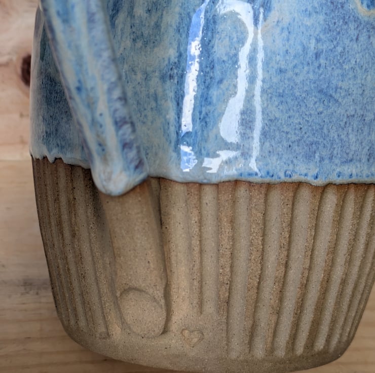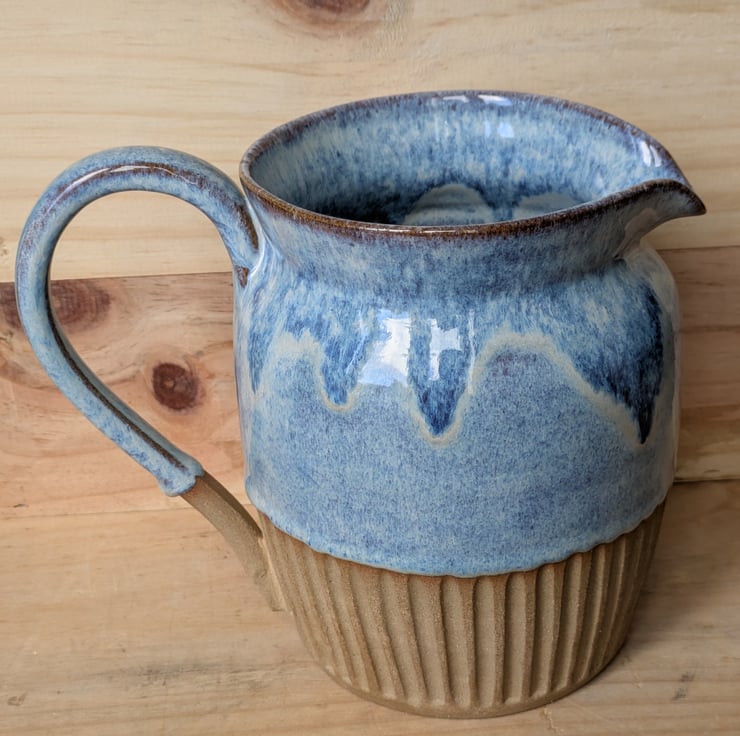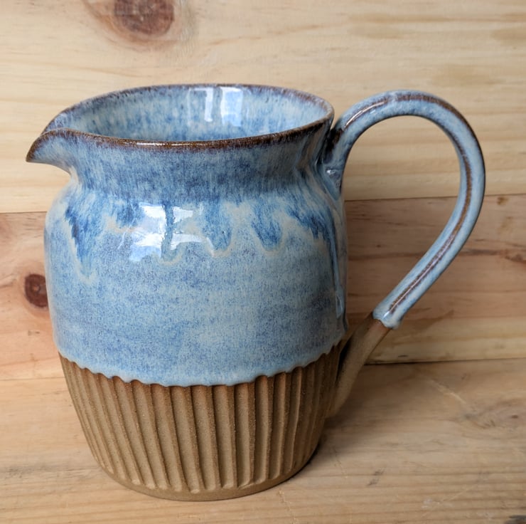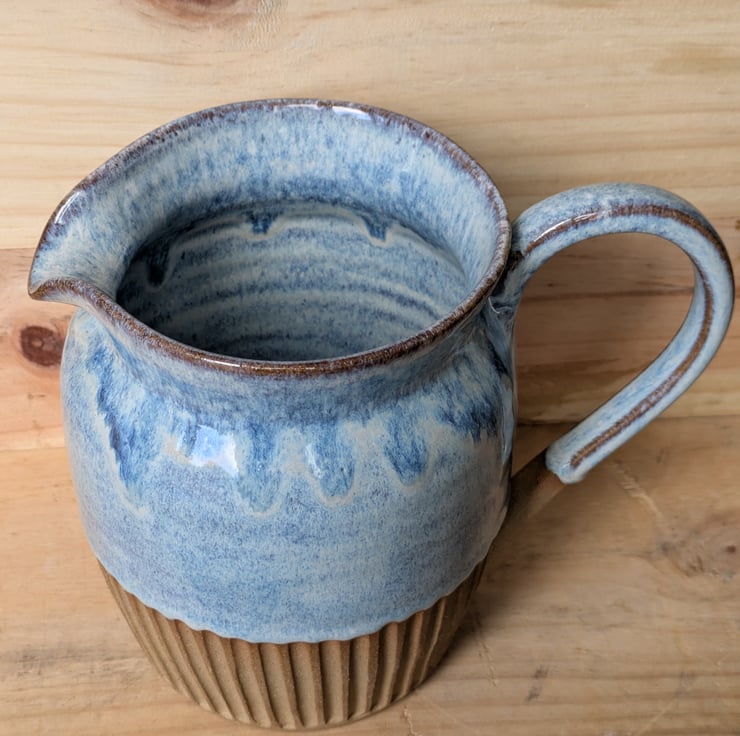 I've used a toasted clay for this jug with a shoulder which gives a lovely warm colour when fired. Each of these will be unique as the flow of the glaze will be different every time. Have left the bottom carved section unglazed. This is the perfect size for milk, custard or gravy when there are several of you eating! Fired to c1200 degrees (stoneware temperature) and this makes the jugs more durable.