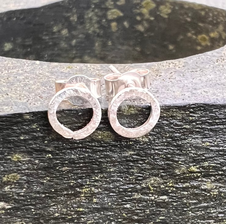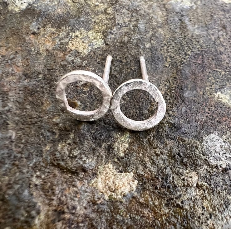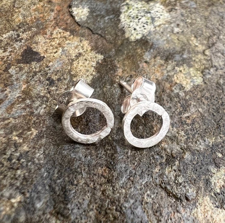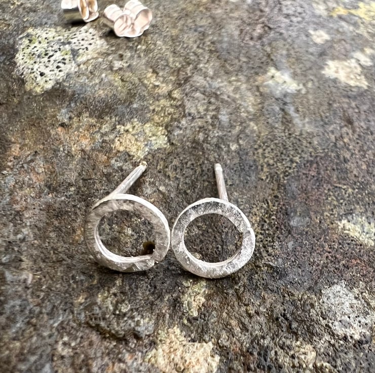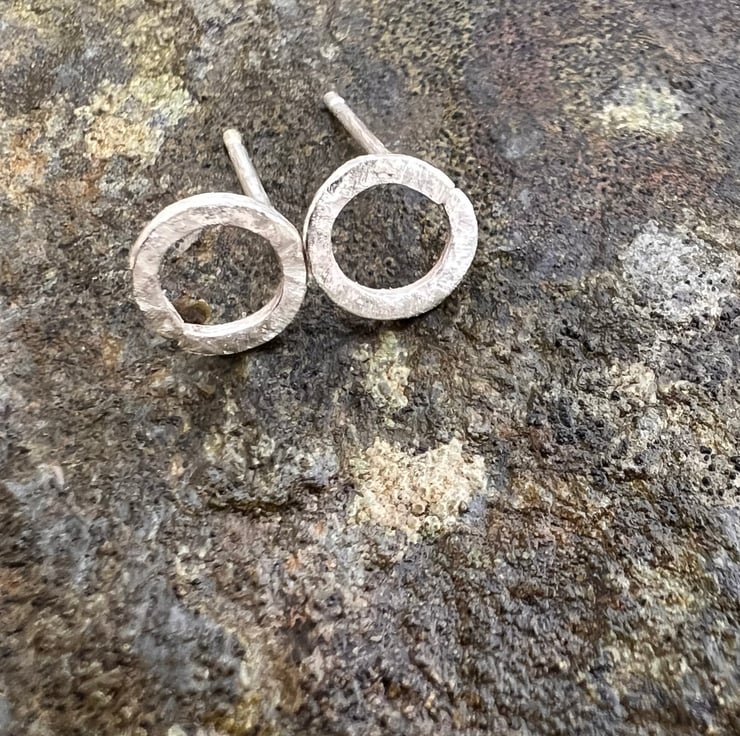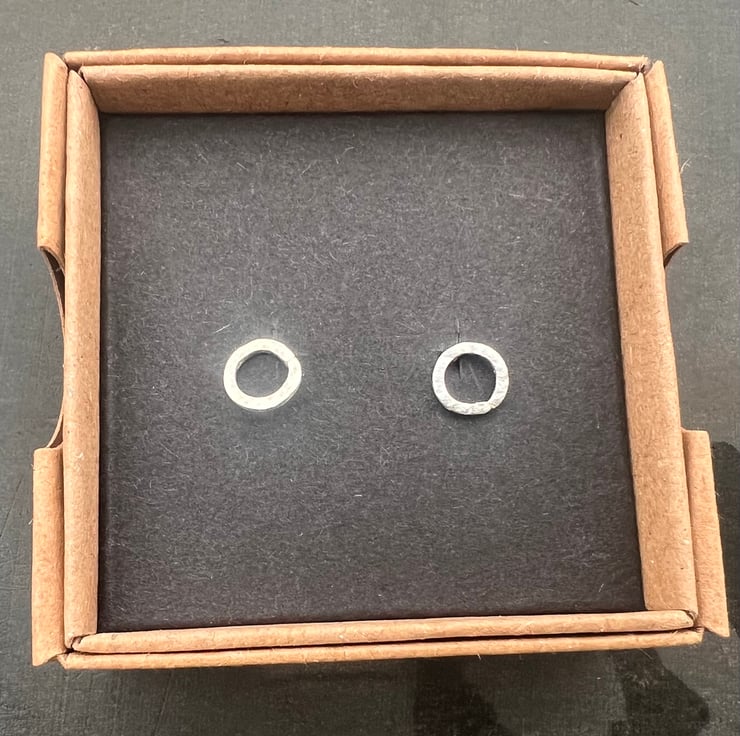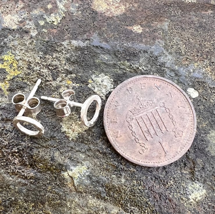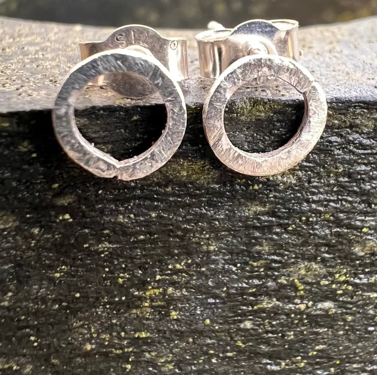 The earrings measure about 8mm/ 0.25 inches in diameter. The earposts and scroll backs are sterling silver. All silver is from an eco source .