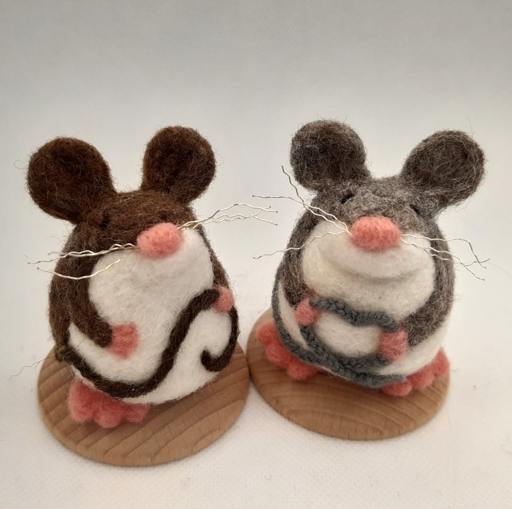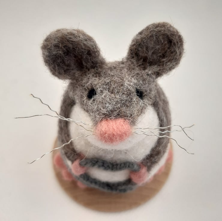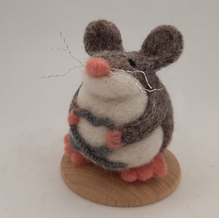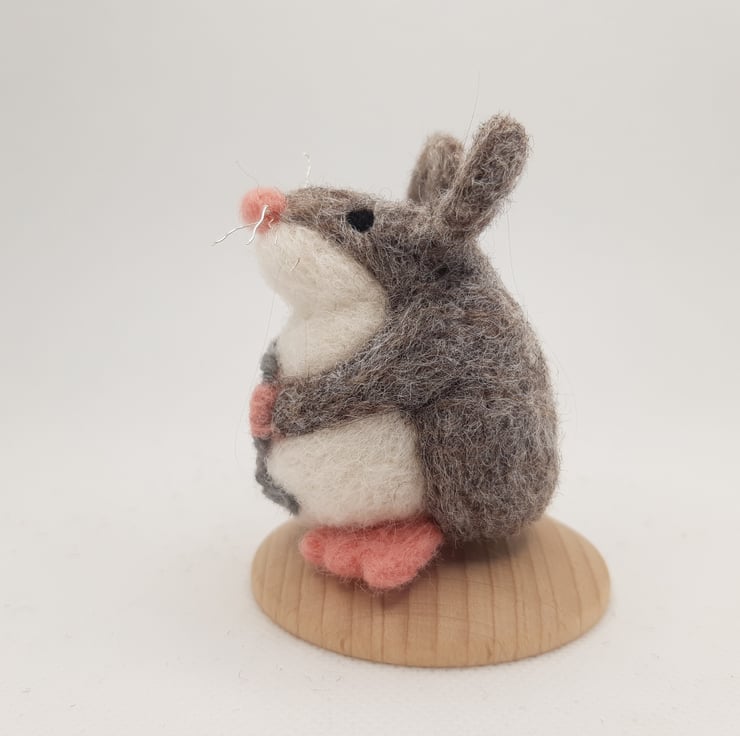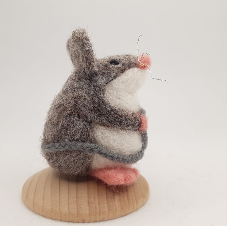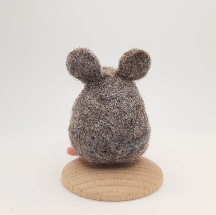 Cute needle felted grey rat ornament with heart curled tail, wire whiskers and a wooden base.