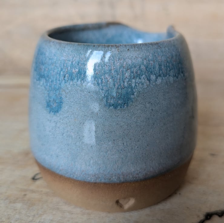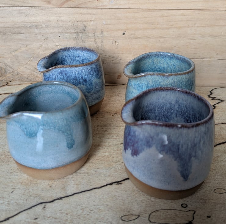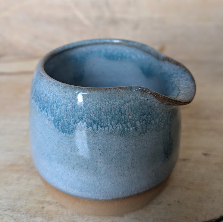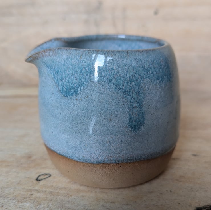 Great wee toasted clay jug in a pale green glaze...love this colour! There are 4 of these, each a different colour. Ideal size for milk/cream & perfect for one! Fired to c1200 degrees (stoneware temperature) and this makes it more durable.