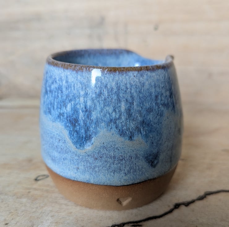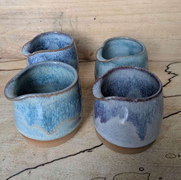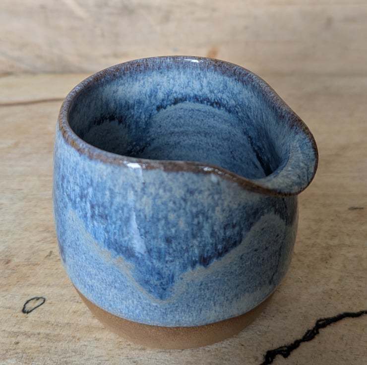 Great wee toasted clay jug in a pale blue glaze...love this colour! There are 4 of these, each a different colour. Ideal size for milk/cream & perfect for one! Fired to c1200 degrees (stoneware temperature) and this makes it more durable.