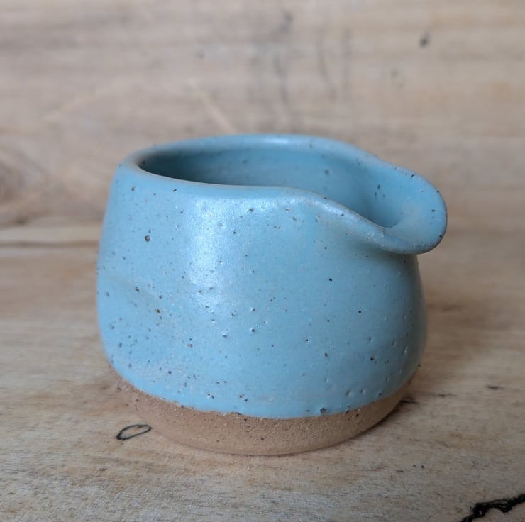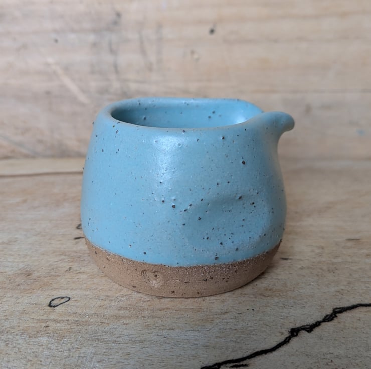 Great wee speckled pale green glaze milk/cream squat jug in speckled clay, perfect for one! This has finger/thumb indentations in the sides. Fired to c1200 degrees (stoneware temperature) and this makes it more durable.