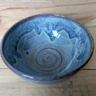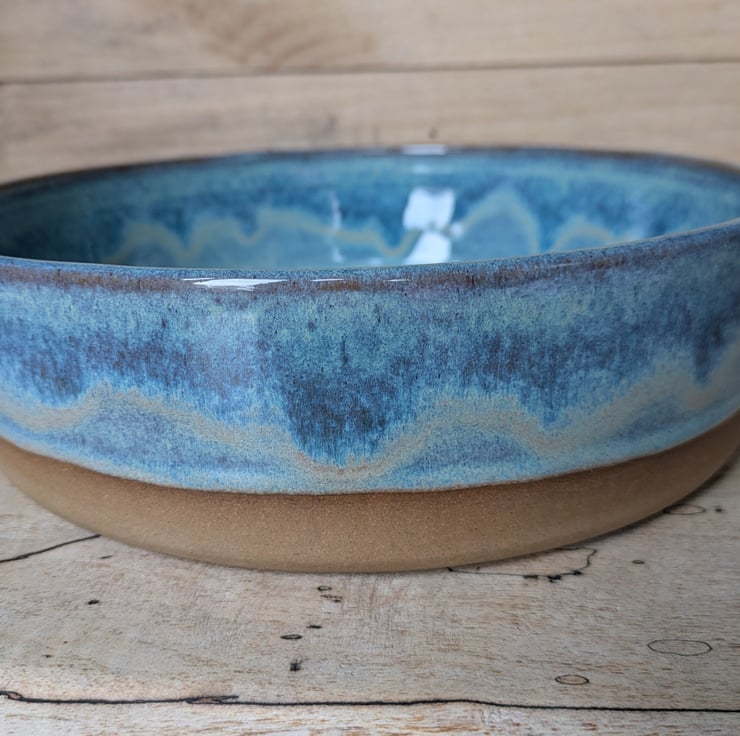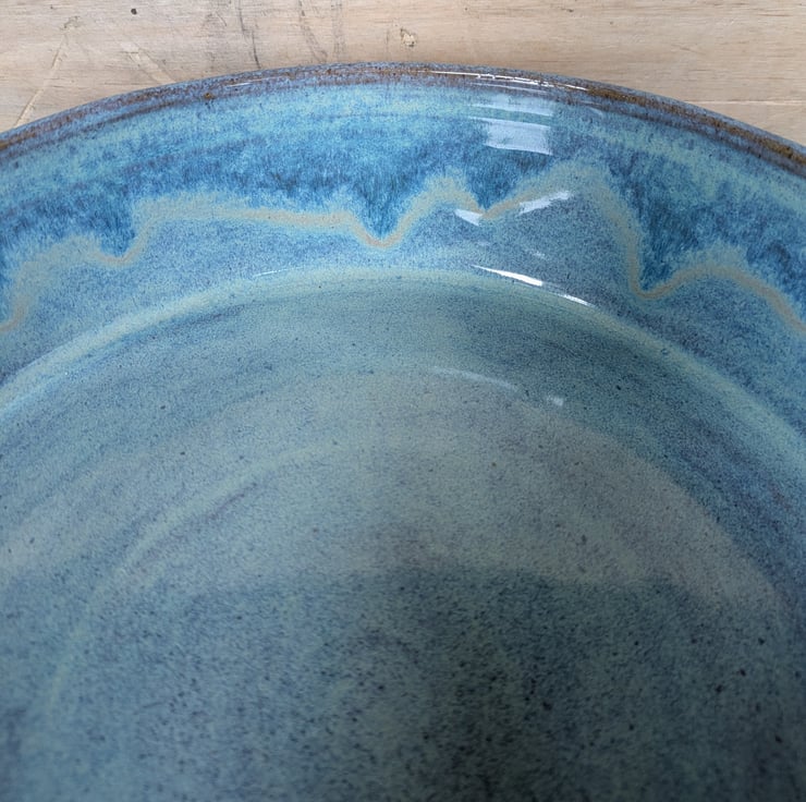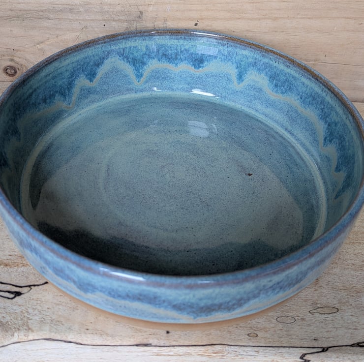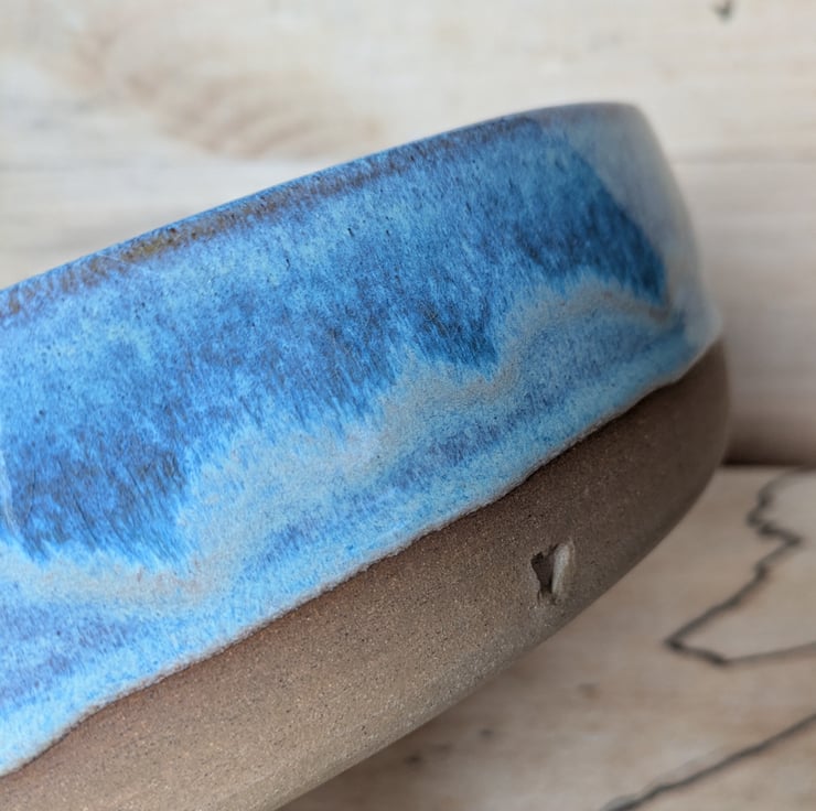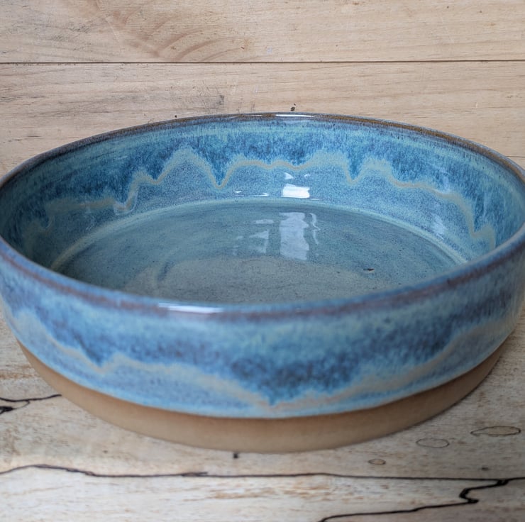 Have used a toasted clay and love the colour it comes out as when it's fired. Tricky to show its colour in the photos as the camera doesn't quite show it exactly but it's a lovely turquoise bluey colour. I also love having the bottom edge of the clay exposed...great to get the feel of the clay. Perfect as a serving dish or for salad.