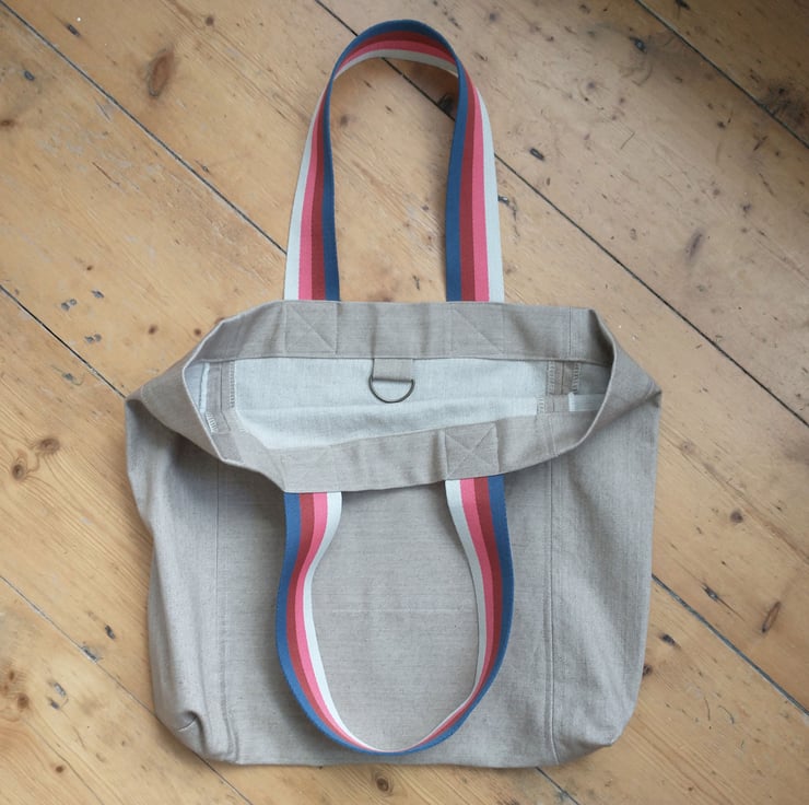 Large tote bag made from a thick but soft denim in a lovely beige oatmeal colour with a pale reverse side and the cotton webbing handles have woven cream, pink, rust and blue stripes. This spacious bag is made from fabric remnants leftover from making pottery aprons, and is a one-of-a-kind piece. Inside there is a pocket and D-ring for attaching your keys. A strong and versatile bag useful for work, shopping, travel, holidays and makes a practical, eco-conscious gift.
