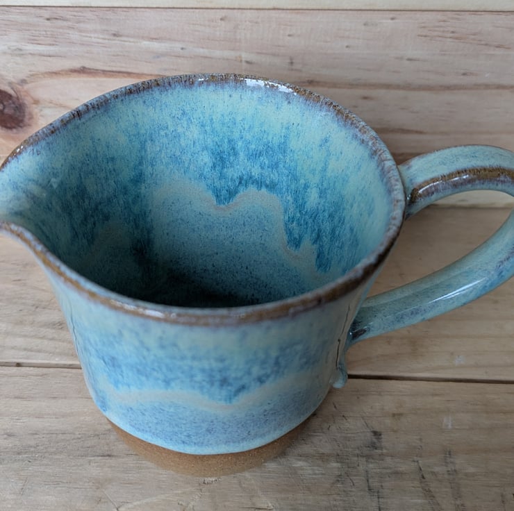 Lovely medium sized jug with the bottom edge of the toasted clay exposed. Love the way this gorgeous turquoise glaze flows and floats down to create a wave effect plus the joy of a drip! Fired in a kiln at a stoneware temperature (c1200 degrees) makes it durable and each one comes out of the kiln looking slightly different.
