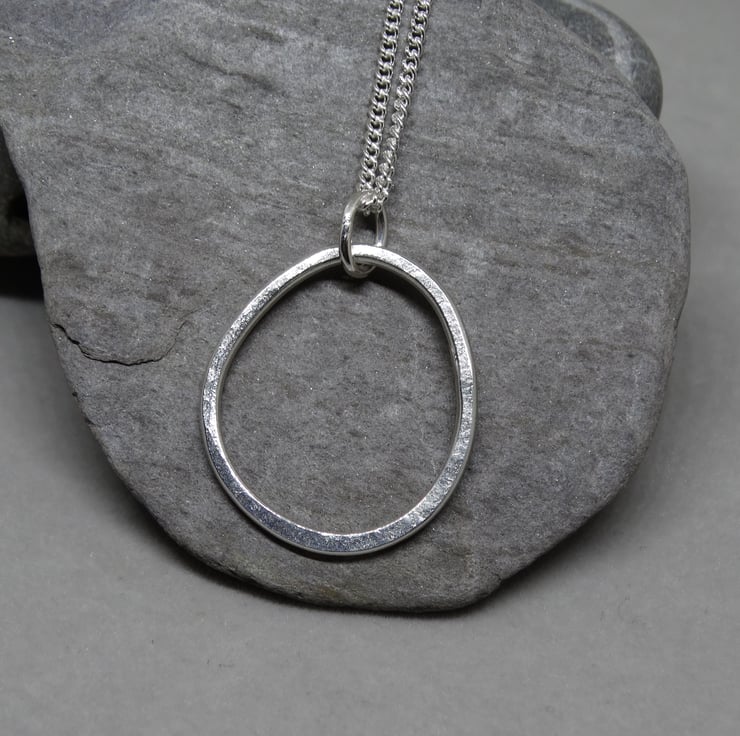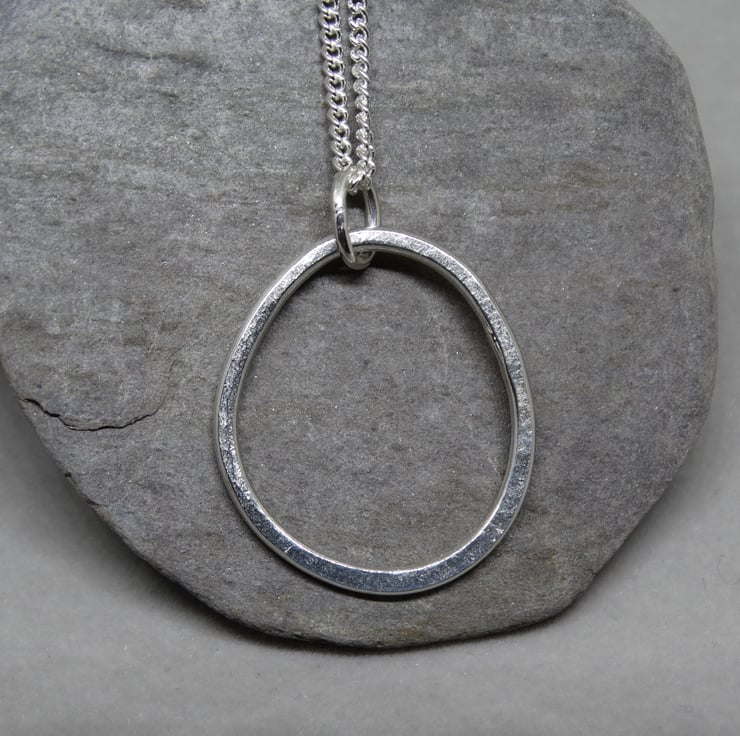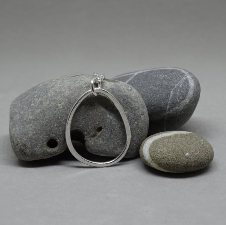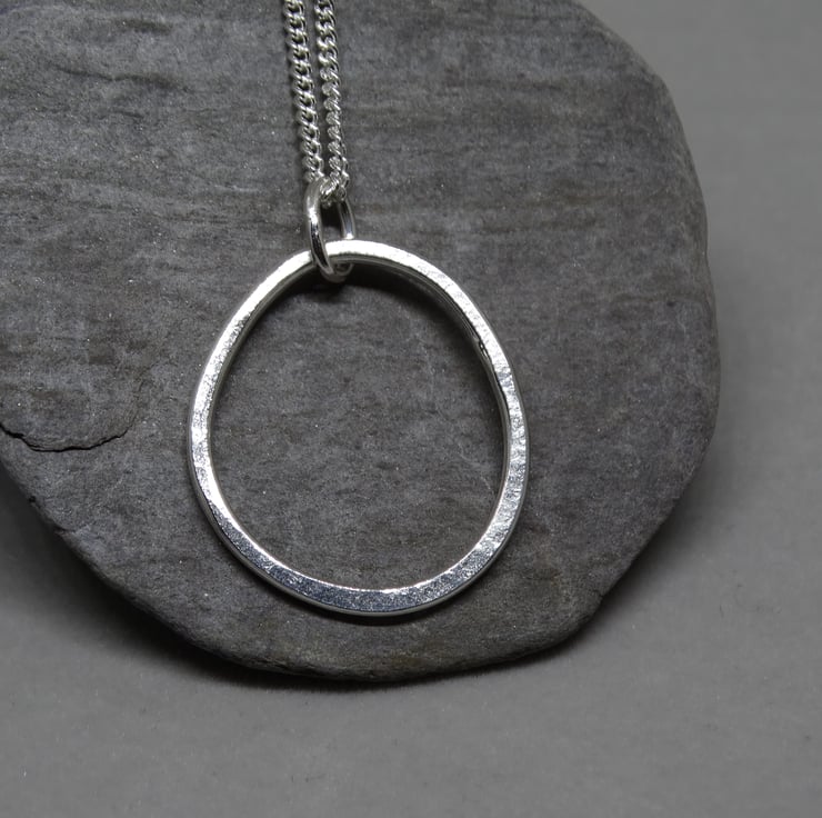 A simple, contemporary pendant, crafted by hand from recycled sterling silver. The pebble-shaped hoop has been lightly hammered to give it a subtle texture.
