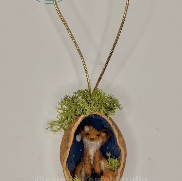 Tiny needle felted wool fox, gazing out of half a walnut shell. The fox sits in front of a painted moonlit night sky, surrounded by moss. This hanging decoration hangs by a gold thread and makes a lovely Christmas decoration but is suitable for all year round.