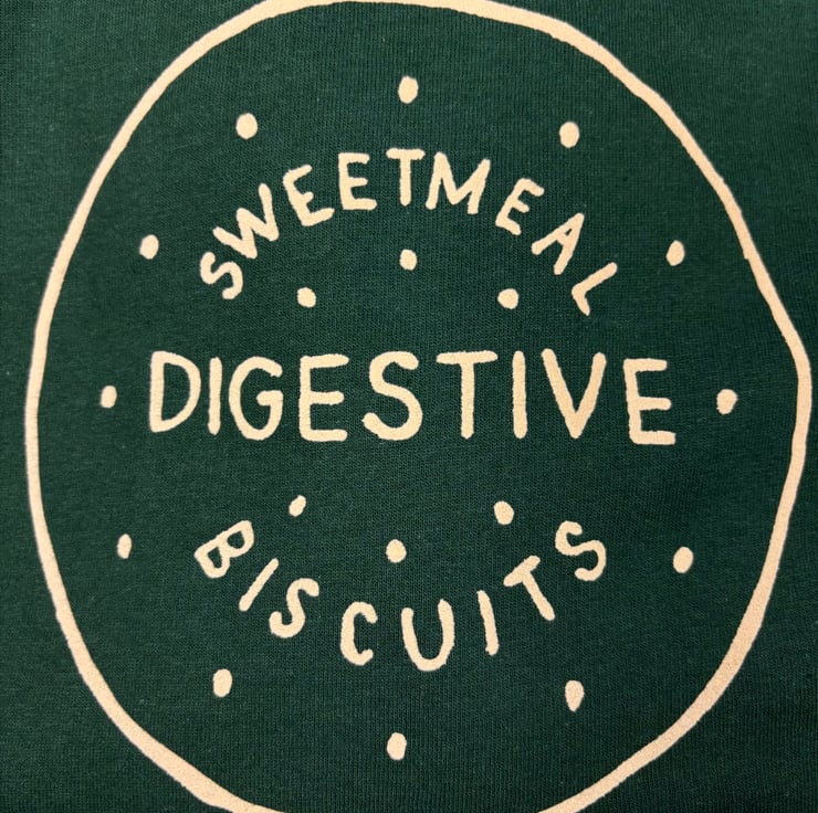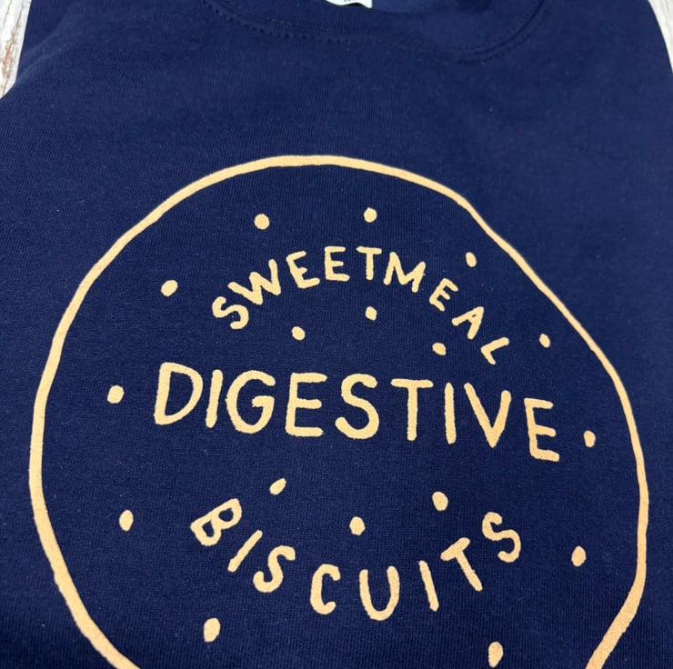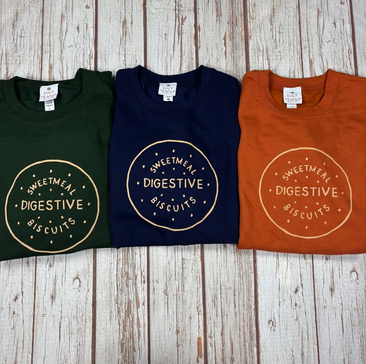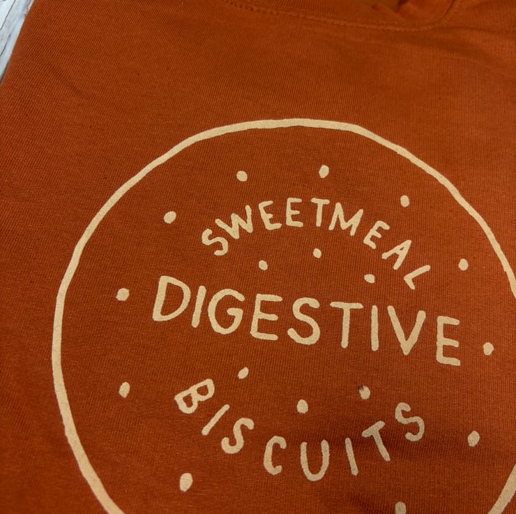 One of the best biscuit for dunking- the reliable digestive! Wear it on your chest to prove your love for it! These are all high-quality sweatshirts with the digestive biscuit in cream flock on the front. The Lucy Teacup cup logo sits on the back of the sweatshirt on the lower left side.