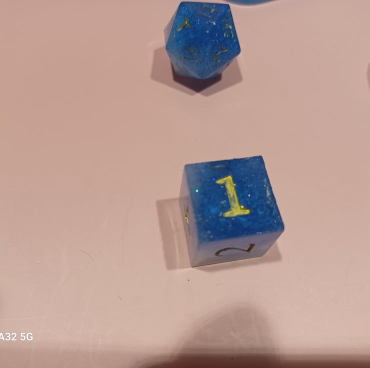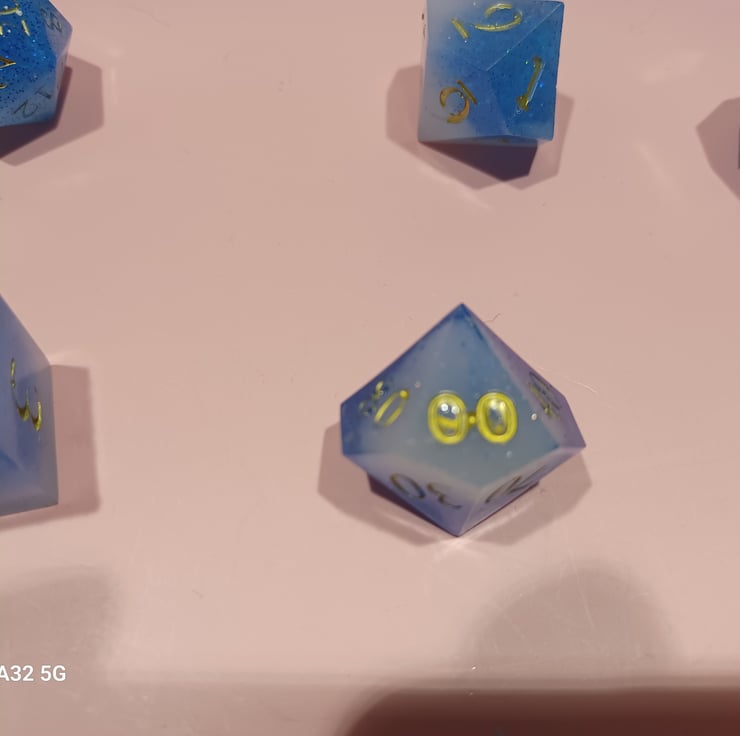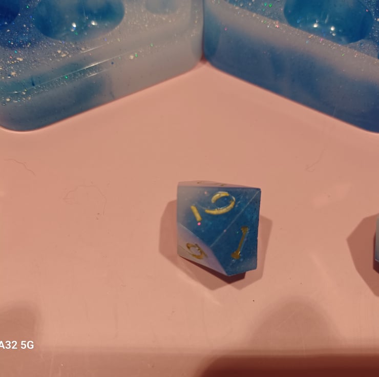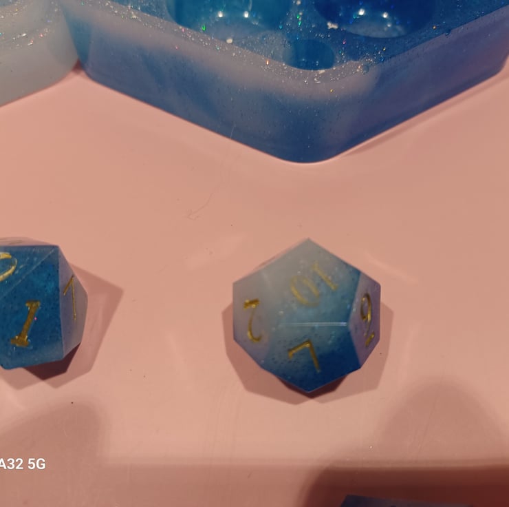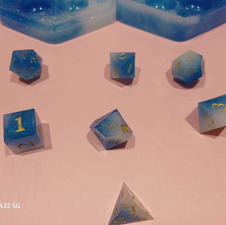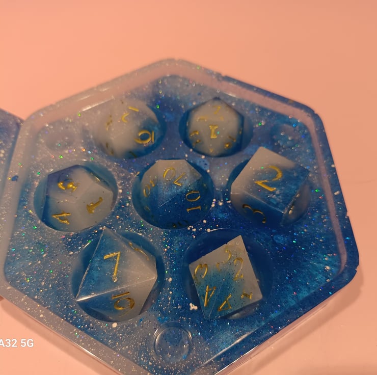 A set of 7 different resin dice in a specially made matching box. This set is in blue and white with chunky glitter and gold painted numbers. The dice set is ideal for any role playing fans or dungeons and dragons gamers. This set comes in three different colourways or can be custom ordered in any colours of your choice.